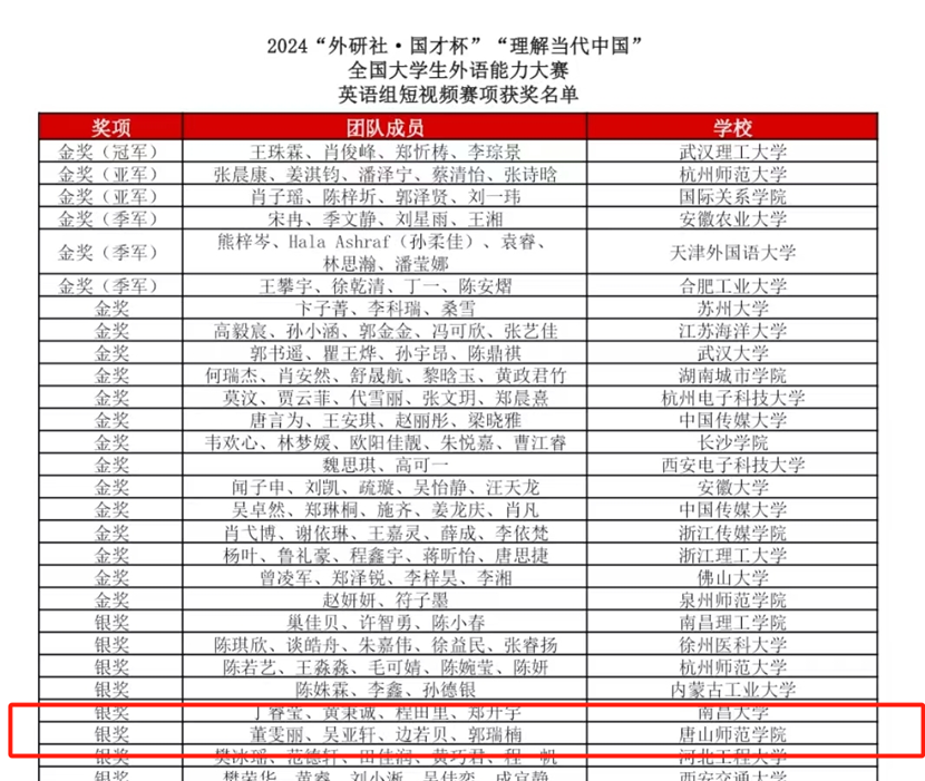 万象城外国语学院德语专业学生胡博雅获得德语组银奖、资源管理系学生孟子杨团队和文学院学生董雯丽团队均获英语组短视频赛项银奖、外国语学院日语专业学生侯晓纯获得日语组铜奖、生命科学系学生刘雨薇获得英语组国际传播综合能力赛项铜奖。