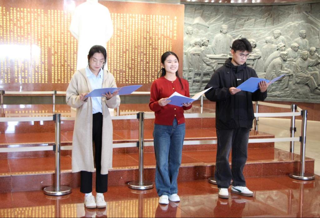 参观结束后,一场别开生面的现场教学活动在纪念馆大厅展开。三名研究生代表深情朗诵了根据李大钊同志的经典名篇《青春》改编的诗歌,激昂的文字与饱满的情感交织,再现了先驱对青年、对未来的殷切期望与无限憧憬,引发了在场师生的强烈共鸣。