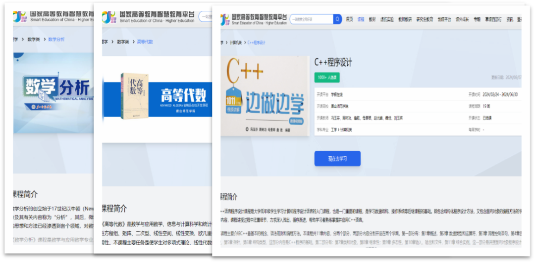 2022年,《高等代数》《数学分析》《C++程序设计》3门课程入选首批国家智慧教育平台课程,截止到现在,三门课程累计选课人数超过12000人次,覆盖300余所高校,课程影响力持续扩大。2025年获批24项校级课程建设项目,为课程资源迭代升级提供保障。