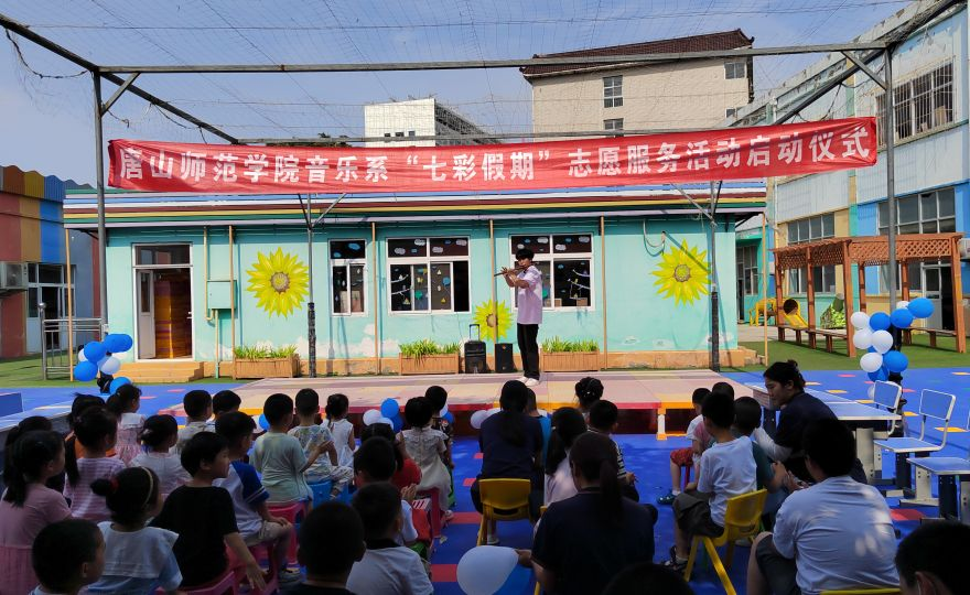 6月27日,音乐系“情系童心,益起同行”志愿服务队来到唐山市路北区幸福摇篮特殊教育培训学校开展“七彩假期”活动启动仪式。音乐系主任张志伟,正处级辅导员王洋,辅导员佟宇、纪文文和8名学生志愿者参加活动。