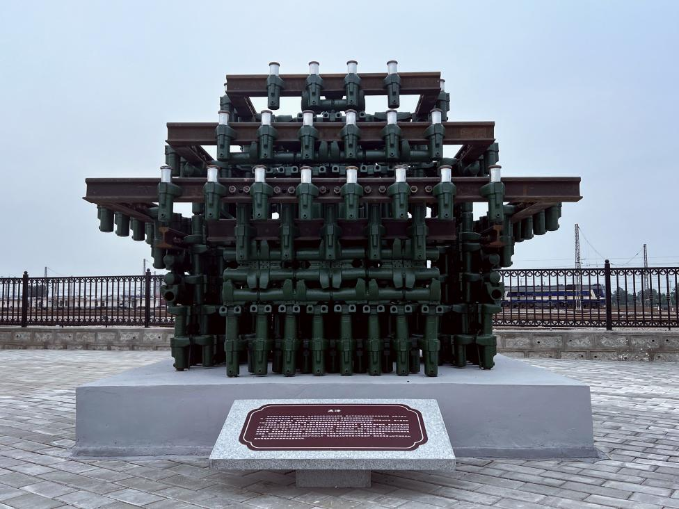该雕塑作品以废弃的铁轨与减速顶为原料,结合驼峰的运行规则与原理,吸收青铜鼎与古建筑的造型特征,表现了唐山市的工业文化和城市精神,诠释了唐山站“百年传承、优质创新”的企业文化及唐站干部职工勇担使命、勇攀高峰的团结奋进精神。作品完成后,在唐山东站组织的北京局车务系统现场会上获得了与会人员的一致好评。