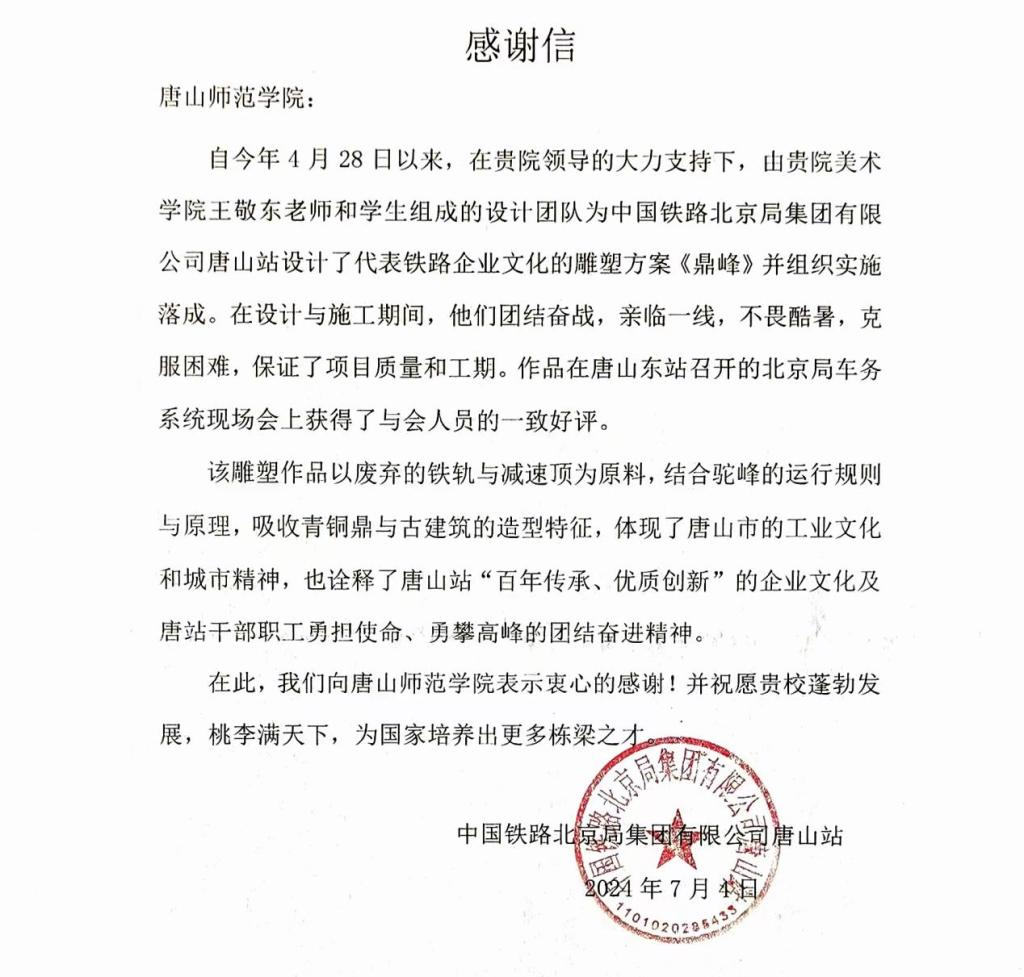 7月4日,唐山站为万象城awcsport官网送来感谢信,对学校领导的大力支持,以及设计团队为了保证了项目质量和工期,亲临一线、不畏酷暑、克服困难的敬业精神表示了感谢。