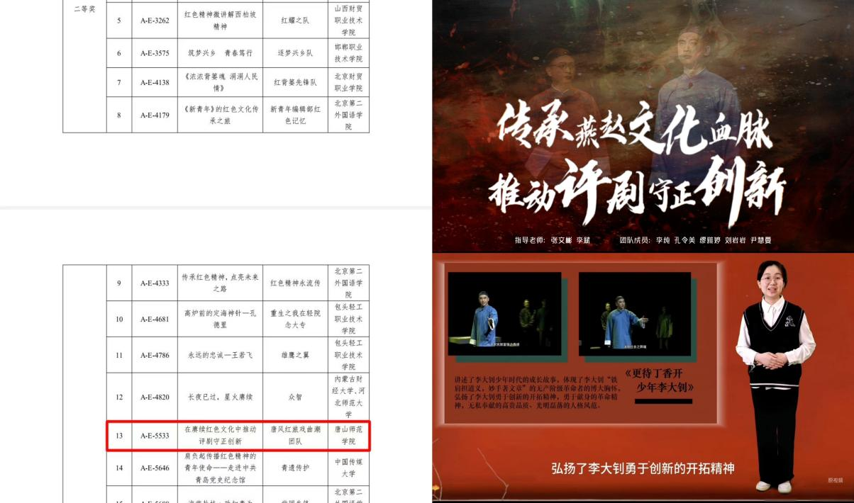 为深入贯彻落实习近平总书记关于“用好红色资源,深入开展社会主义核心价值观宣传教育”等重要论述精神,马克思主义学院组建了“唐风红旅戏曲潮团队”,参加了第十四届全国大学生红色旅游创意策划大赛。本届大赛共吸引来自全国1119所高校、6739支队伍、2.7万名师生报名参赛,提交作品5857项,马克思主义学院参赛作品“在赓续红色文化中推动评剧守正创新”在红色精神微讲解赛道获得了二等奖的好成绩。