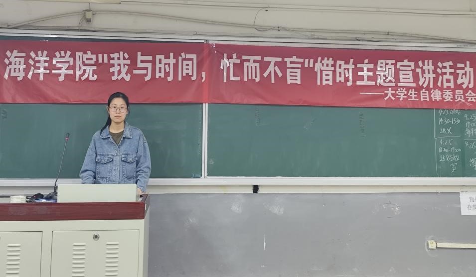 为引导大学生学习时间管理技巧,激励学生培养自律精神,海洋学院于4月25日开展“我与时间,忙而不盲”惜时主题宣讲活动。