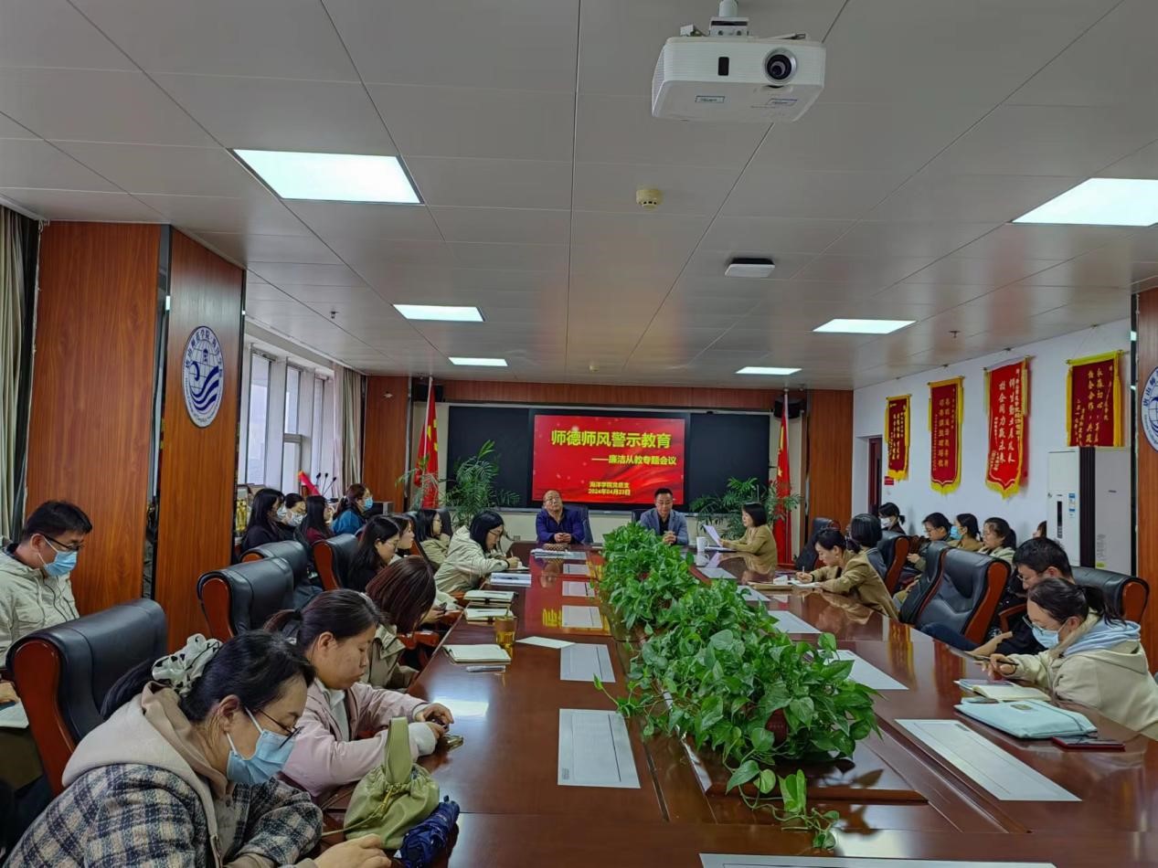为贯彻落实教育部、省教育厅和学校关于廉洁文化建设的部署要求,加强海洋学院廉洁文化建设,4月23日下午,海洋学院召开师德师风警示教育暨廉洁从教专题会议,推动压实工作责任,进一步加强和改进师德师风建设。海洋学院全体教师参会,海洋学院党总支副书记霍翠红主持会议。