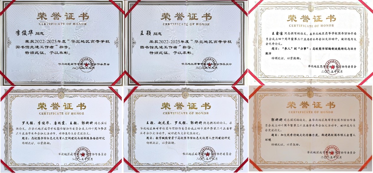 经过华北地区高校图书馆协作委员会的严格评审,万象城awcsport官网图书馆凭借扎实的工作和突出的服务成效,荣获“华北地区高等学校图书馆2022-2025年度先进集体”称号。此外,张海卿、李俊华、王颖、王鑫洁、罗文强、郭妍妍、唐瑞霞等老师积极撰写并提交学术论文,在年会征文活动中表现优异,分别荣获“华北地区高校图书馆先进工作者”“优秀论文”和“交流论文”等多项荣誉。