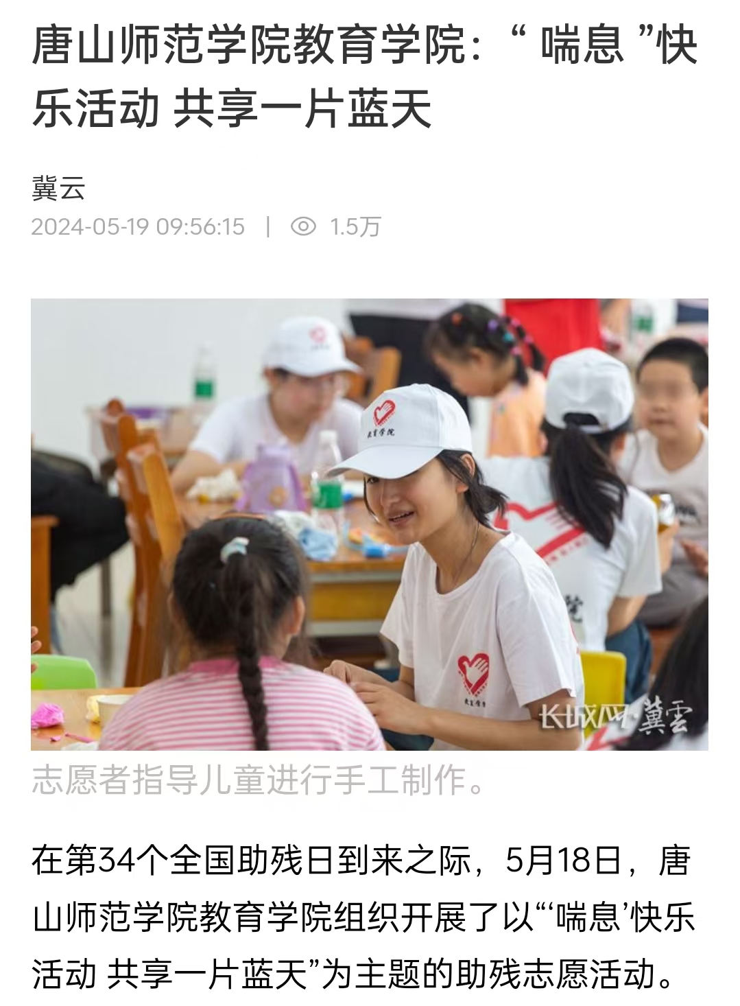 5月18日上午,河北万象城awcsport官网教育学院以全国助残日为契机,面向23家特殊儿童组织开展主题为“‘喘息’快乐活动,共享一片蓝天”的助残志愿活动。