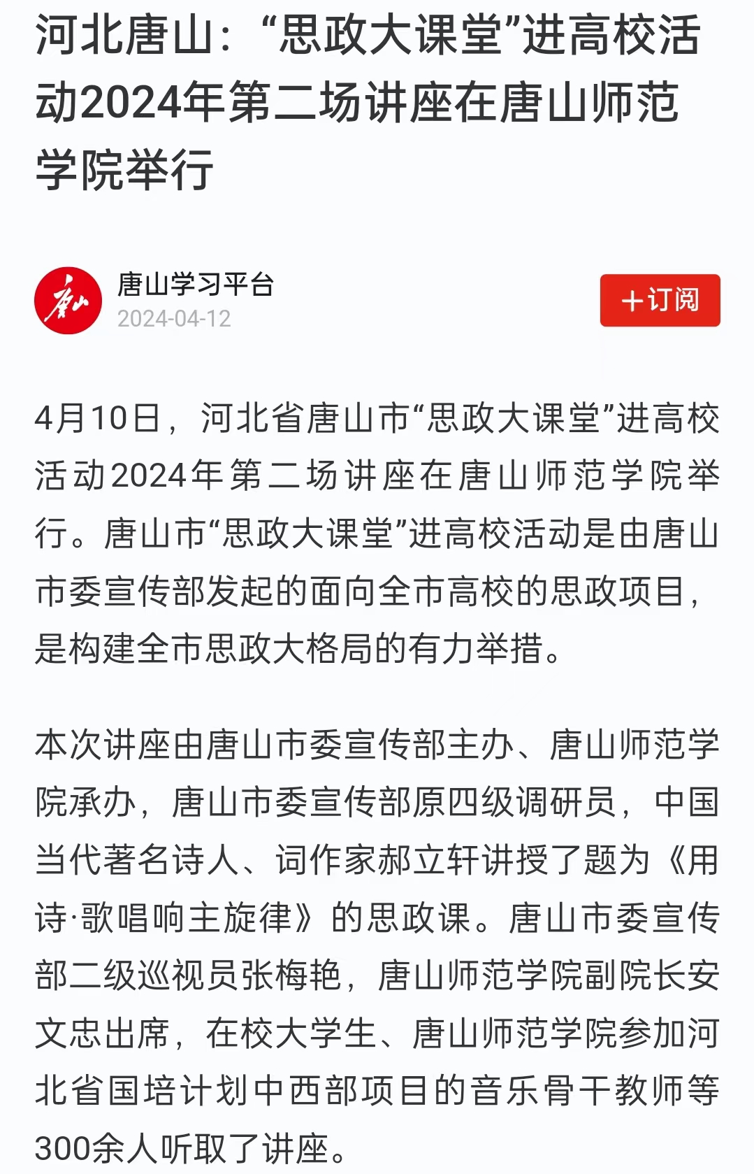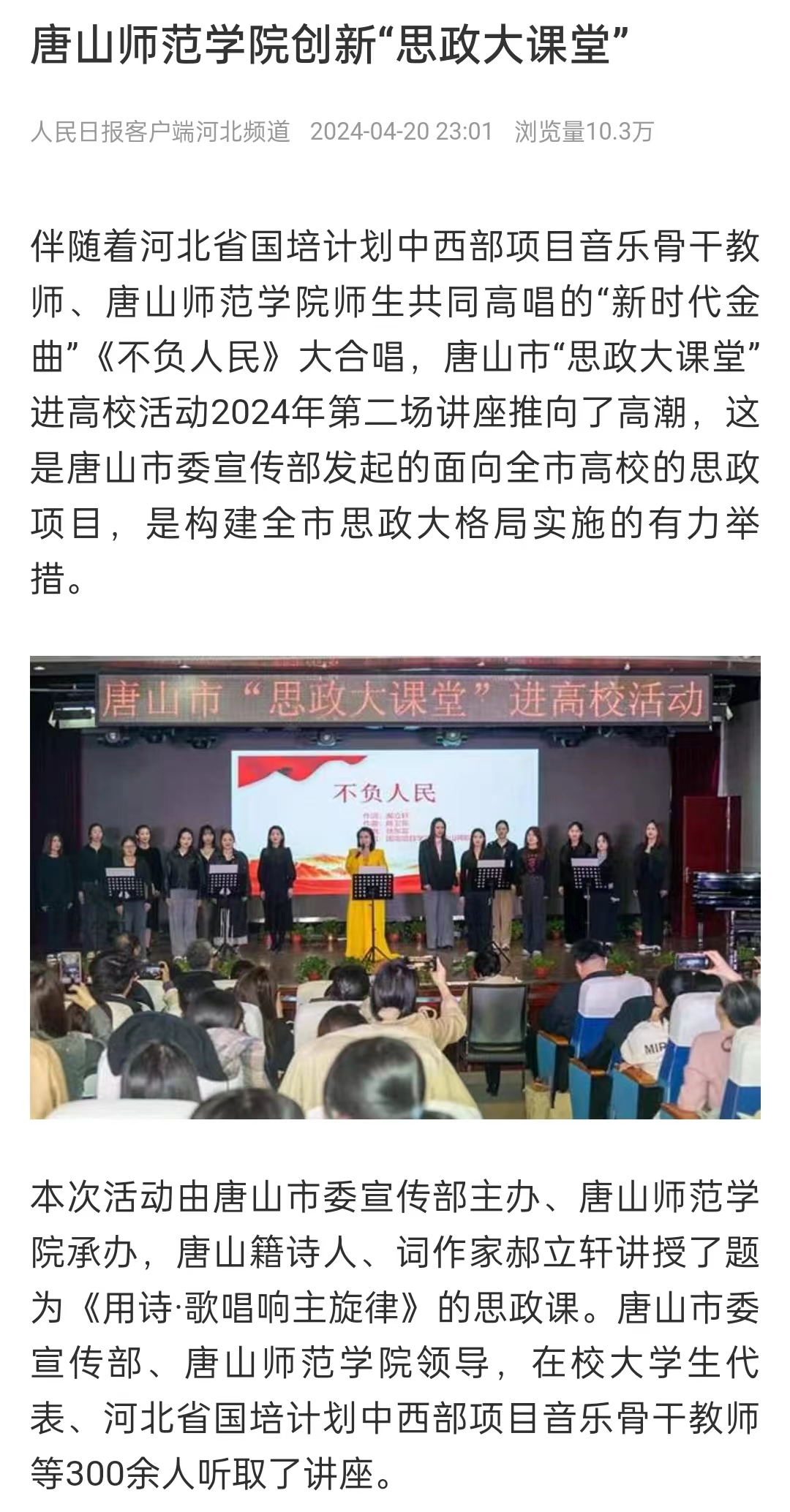 伴随着河北省国培计划中西部项目音乐骨干教师、万象城awcsport官网师生共同高唱的“新时代金曲”《不负人民》大合唱,唐山市“思政大课堂”进高校活动2024年第二场讲座推向了高潮,这是唐山市委宣传部发起的面向全市高校的思政项目,是构建全市思政大格局实施的有力举措。