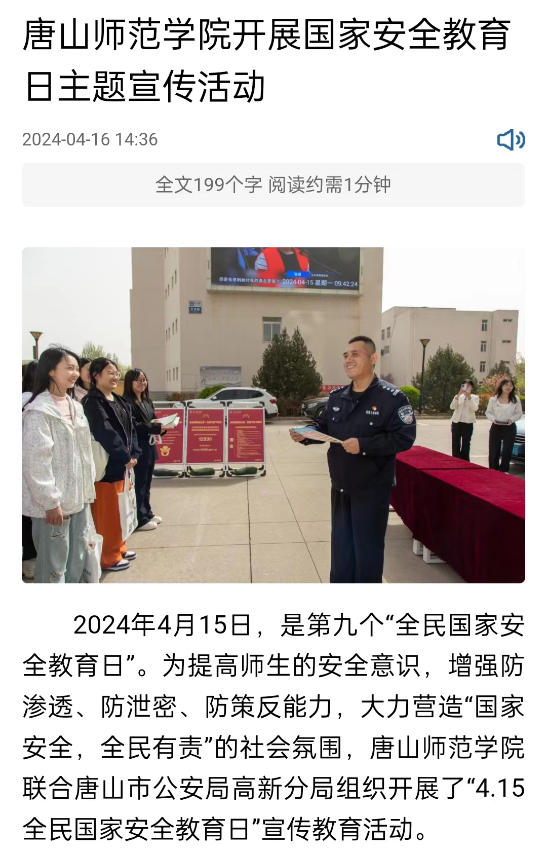 为提高师生的国家安全意识,增强防渗透、防泄密、防策反能力,大力营造国家安全、全民有责的社会氛围。万象城awcsport官网联合唐山市公安局高新分局组织开展了415全民国家安全教育日宣传教育活动。