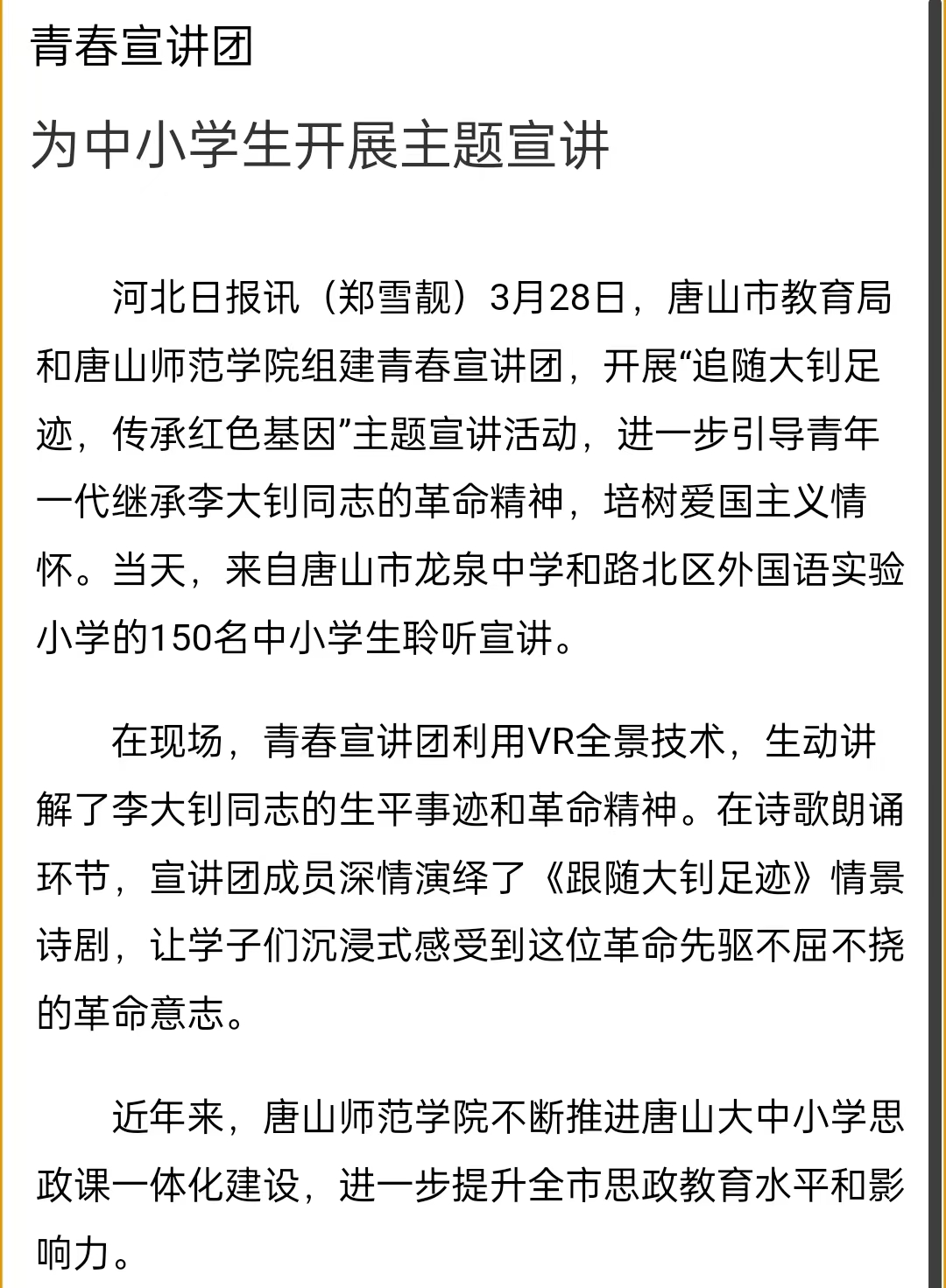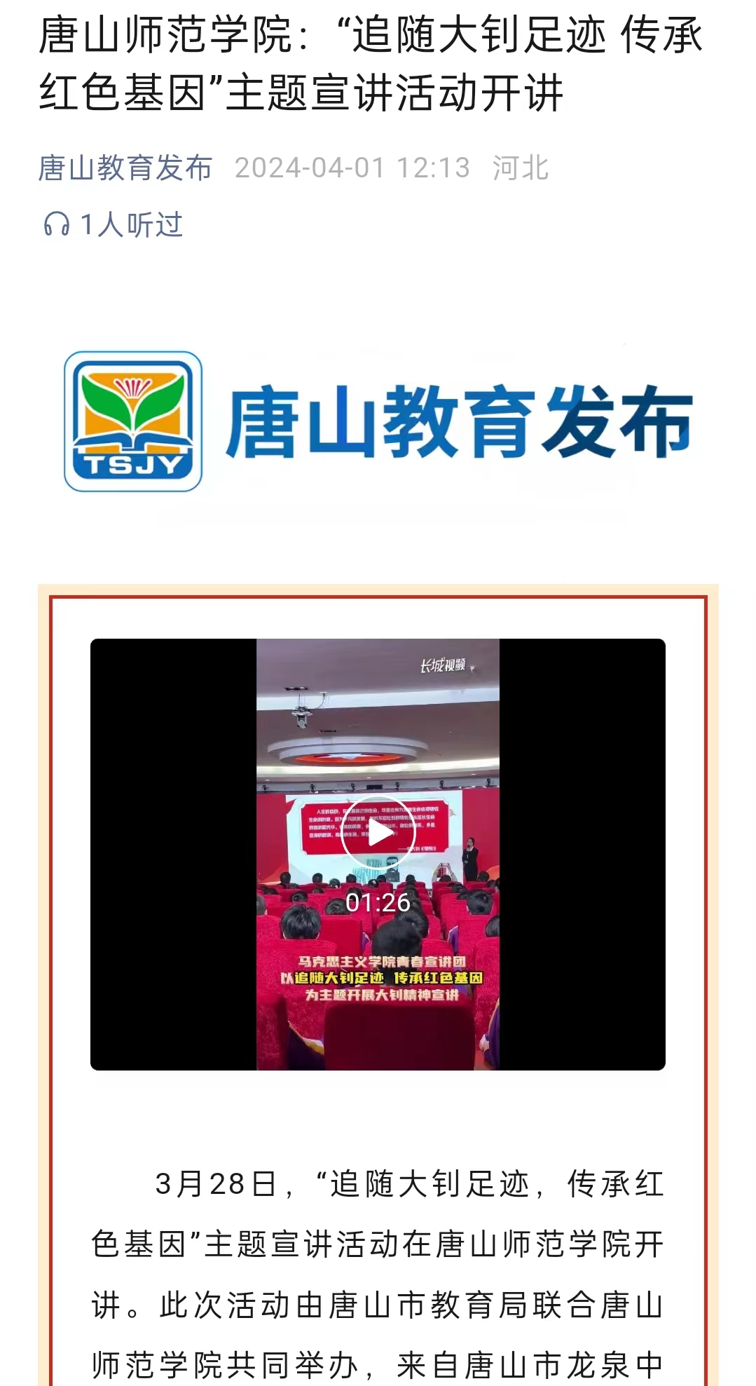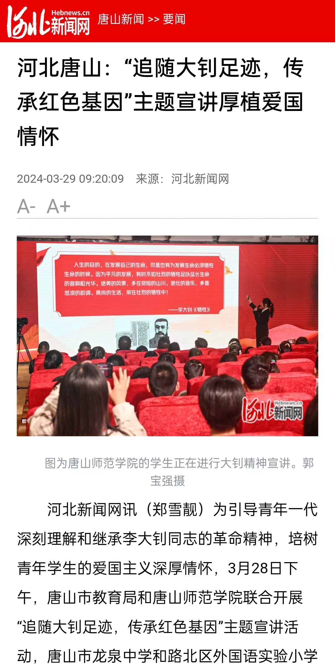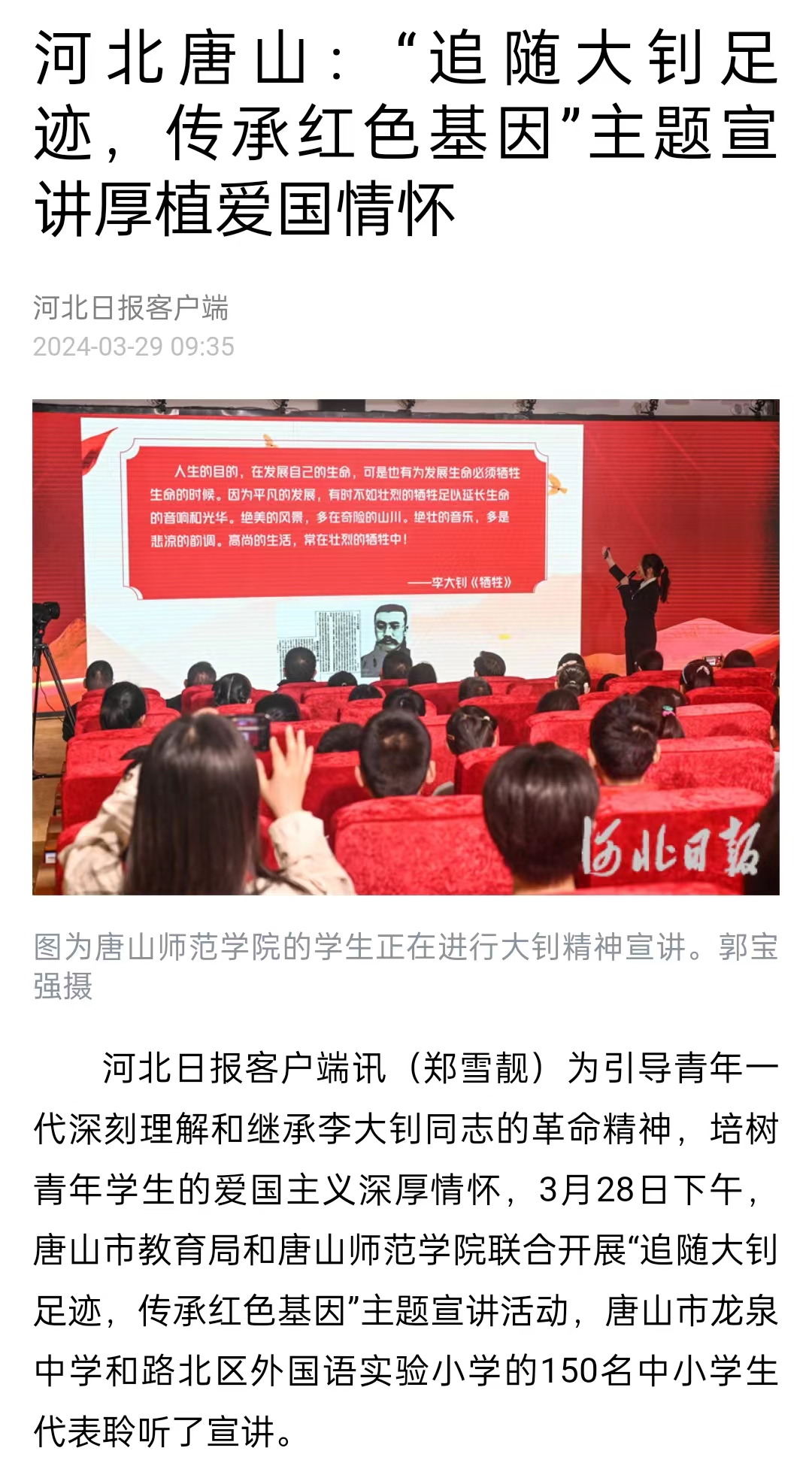 3月28日,“追随大钊足迹,传承红色基因”主题宣讲活动在万象城awcsport官网开讲。此次活动由唐山市教育局联合万象城awcsport官网共同举办,来自唐山市龙泉中学和路北区外国语实验小学的150名中小学生聆听宣讲。