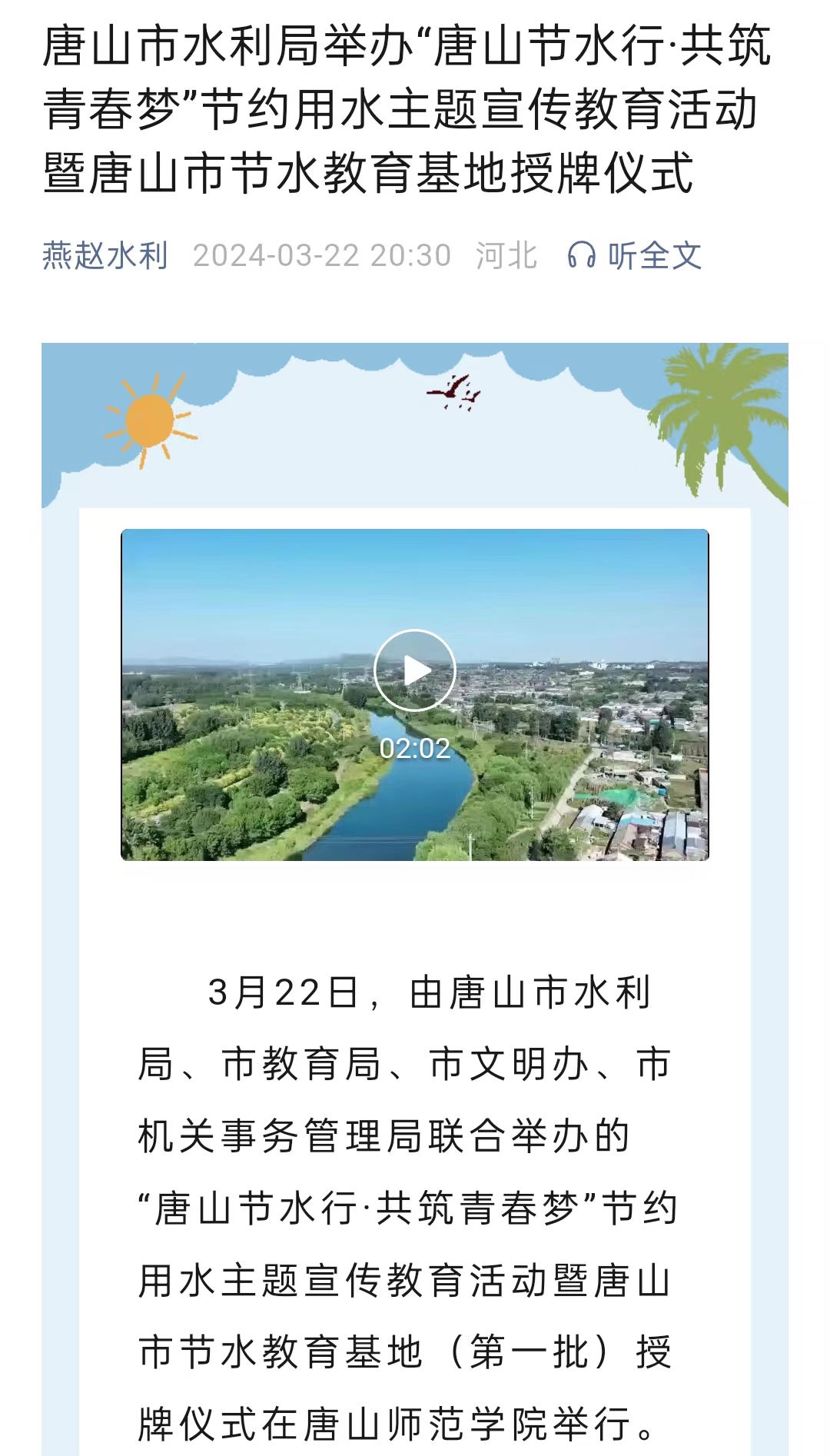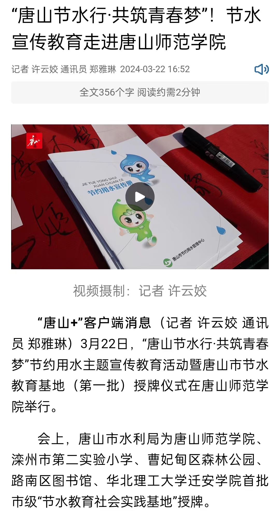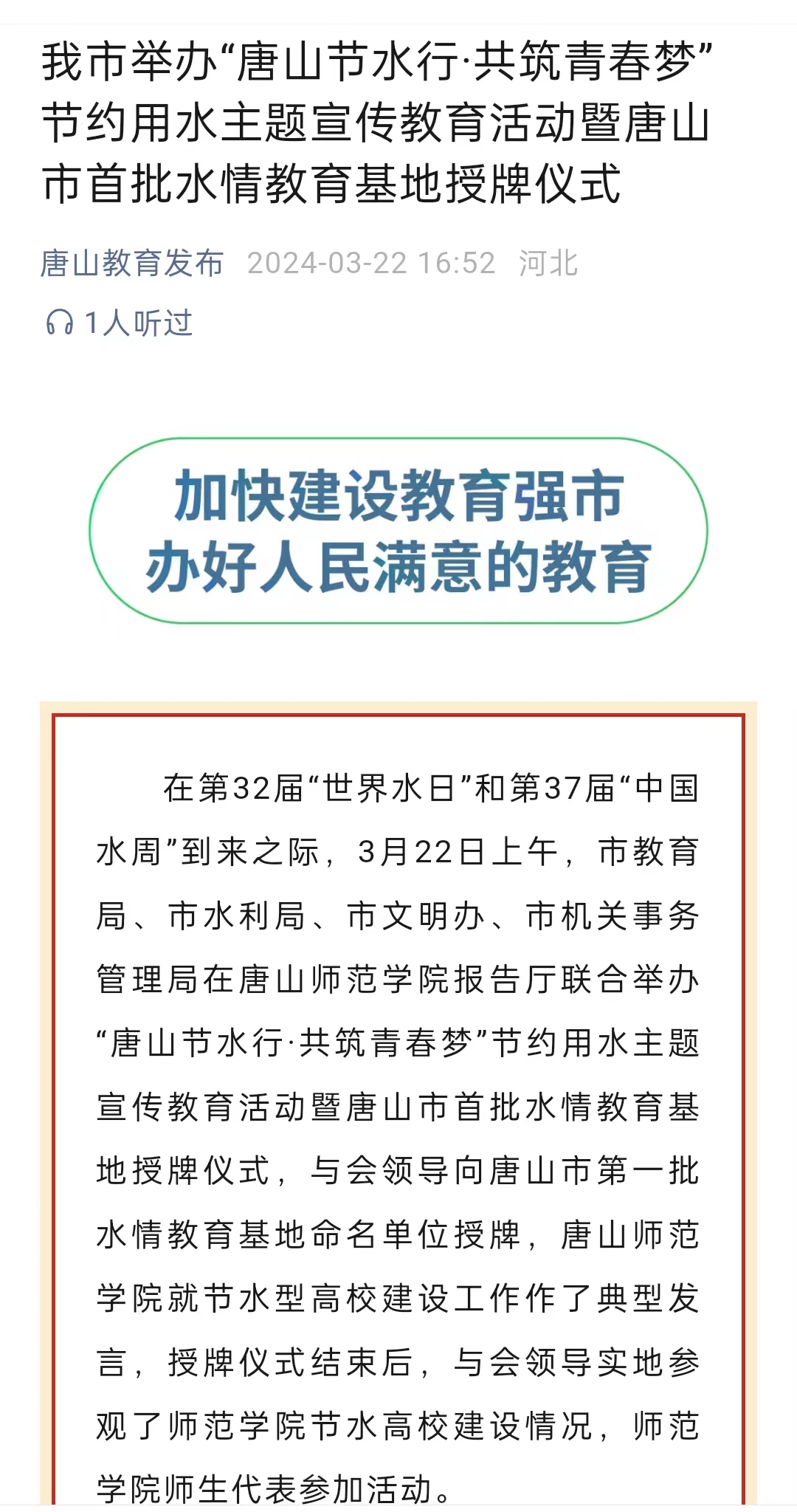 3月22日,由唐山市水利局、市教育局、市文明办、市机关事务管理局联合举办的“唐山节水行·共筑青春梦”节约用水主题宣传教育活动暨唐山市节水教育基地(第一批)授牌仪式在万象城awcsport官网举行。万象城awcsport官网就节水型高校建设工作作了典型发言,授牌仪式结束后,与会领导实地参观了师范学院节水高校建设情况,师范学院师生代表参加活动。
