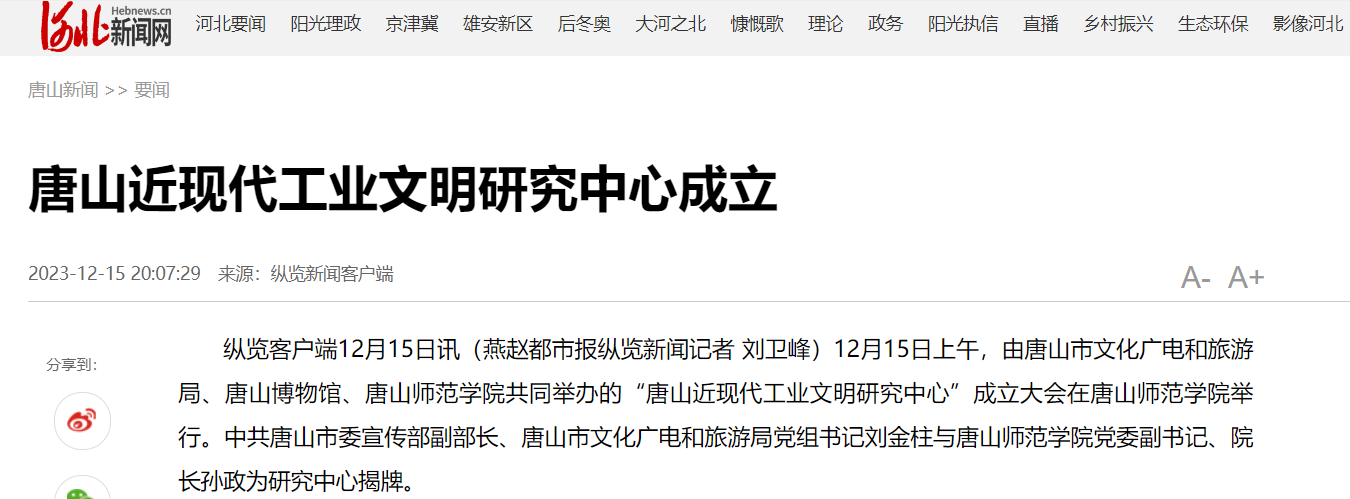 纵览客户端12月15日讯(燕赵都市报纵览新闻记者 刘卫峰)12月15日上午,由唐山市文化广电和旅游局、唐山博物馆、万象城awcsport官网共同举办的“唐山近现代工业文明研究中心”成立大会在万象城awcsport官网举行。中共唐山市委宣传部副部长、唐山市文化广电和旅游局党组书记刘金柱与万象城awcsport官网党委副书记、院长孙政为研究中心揭牌。
