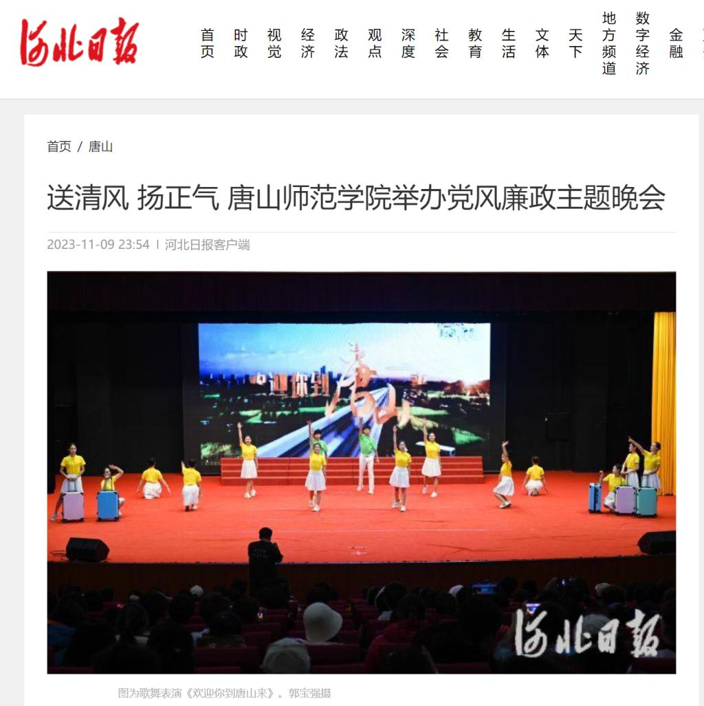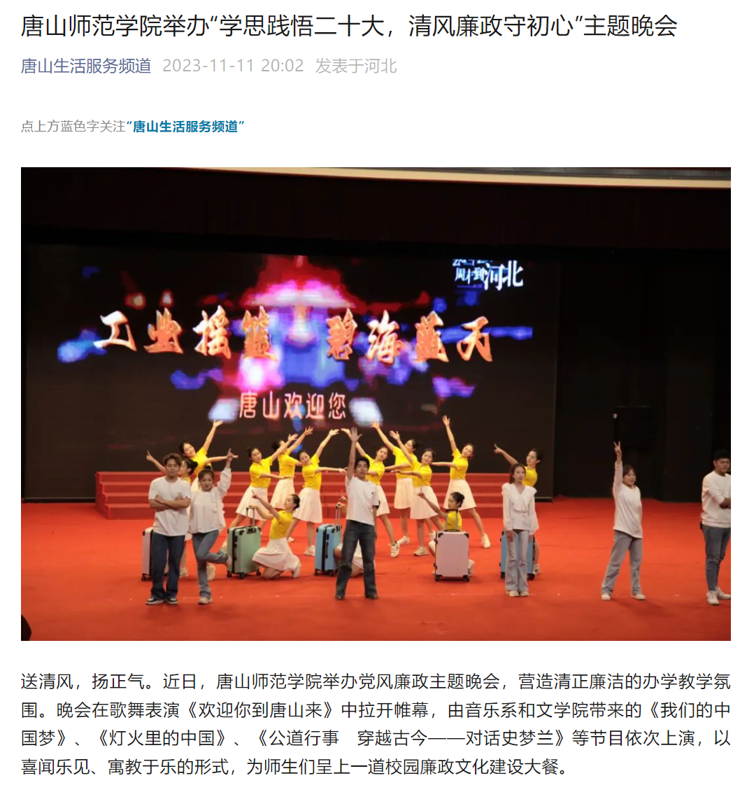 送清风,扬正气。近日,万象城awcsport官网举办党风廉政主题晚会,营造清正廉洁的办学教学氛围。晚会在歌舞表演《欢迎你到唐山来》中拉开帷幕,由音乐系和文学院带来的《我们的中国梦》、《灯火里的中国》、《公道行事 穿越古今——对话史梦兰》等节目依次上演,以喜闻乐见、寓教于乐的形式,为师生们呈上一道校园廉政文化建设大餐。