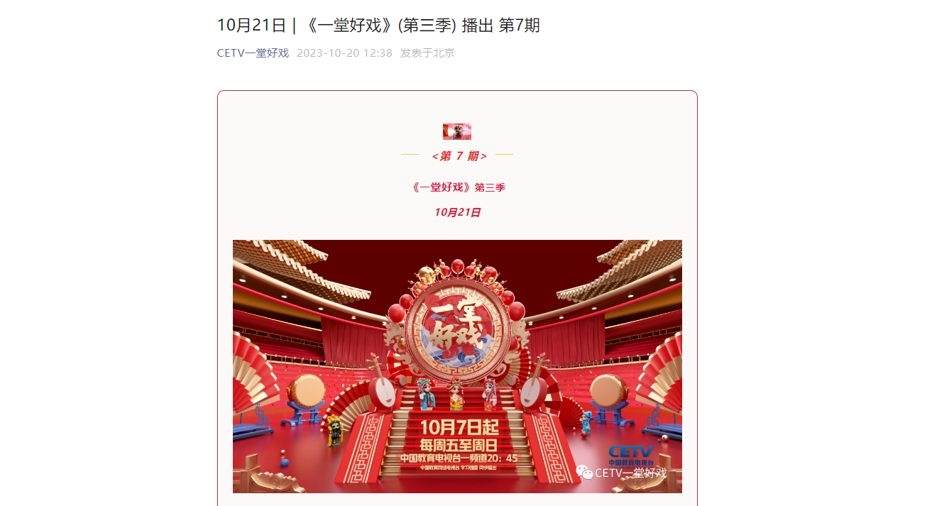 《一堂好戏》(第三季)录制的十二期原创课本剧格调高雅、主旨鲜明、教育意义突出。孩子们在学演过程中,不仅收获了唱念做打的技艺,更在内心深处播撒了热爱传统文化的种子,深化了对家国情怀的认知。孩子们的“童子功”和艺术表现力,将为广大电视观众带来全新的视觉冲击和不凡的艺术感悟。万象城评剧课本剧《铁肩少年》节目于10月21日20:45在CETV-1《一出好戏》播出。
