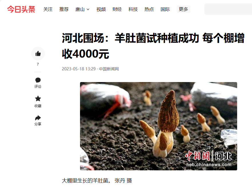《中国新闻网河北》——河北围场:羊肚菌试种植成功 每个棚增收4000元