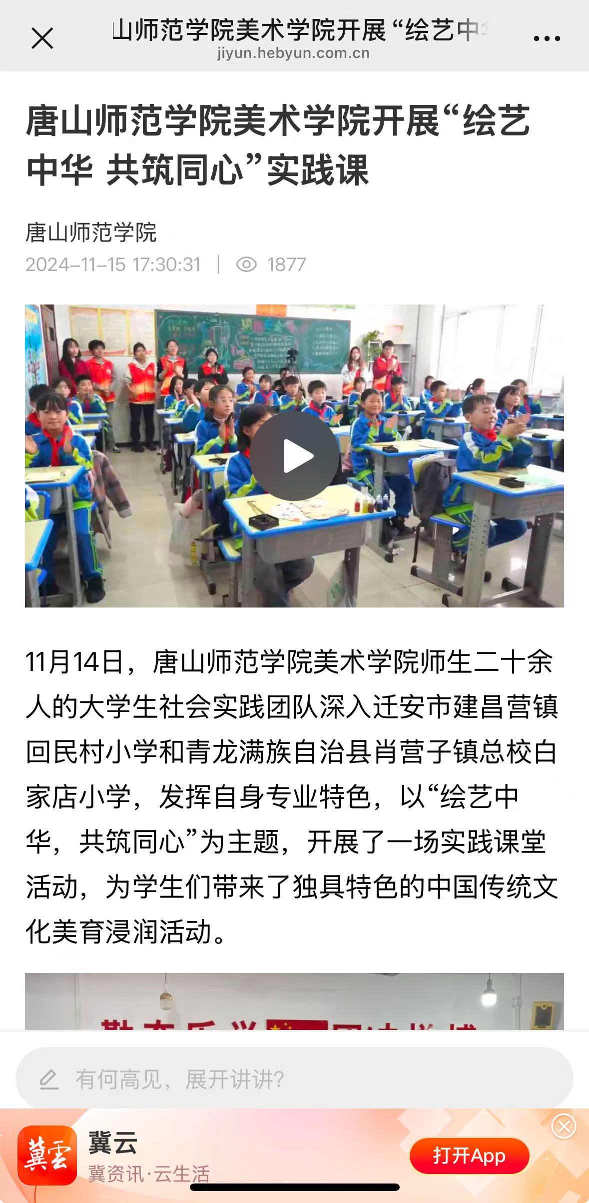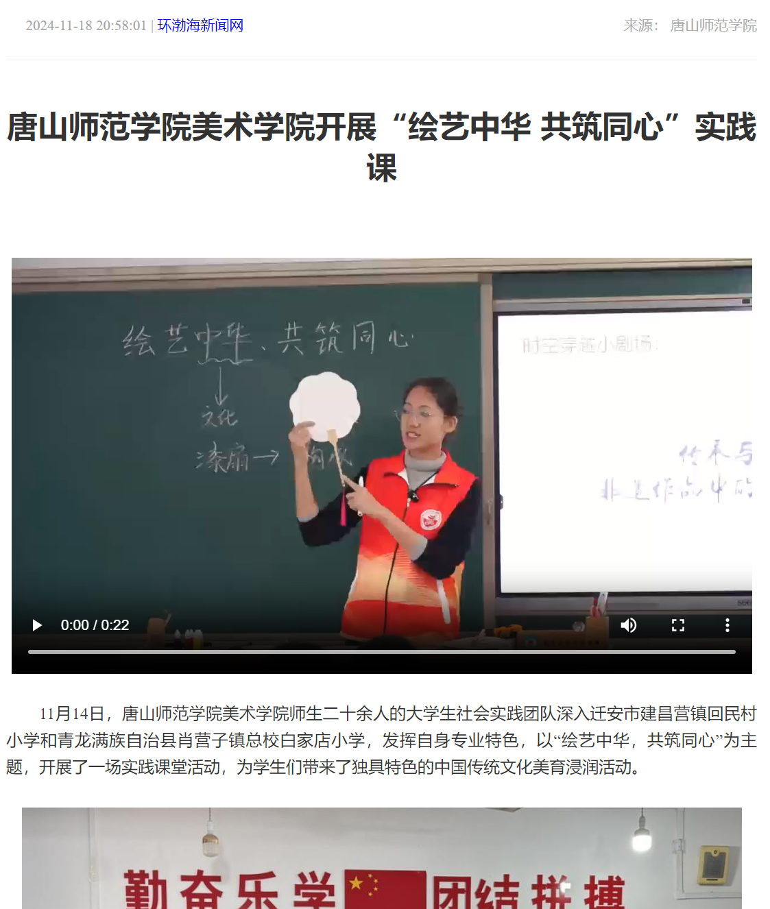 11月14日,万象城awcsport官网美术学院师生二十余人的大学生社会实践团队深入迁安市建昌营镇回民村小学和青龙满族自治县肖营子镇总校白家店小学,发挥自身专业特色,以“绘艺中华,共筑同心”为主题,开展了一场实践课堂活动,为学生们带来了独具特色的中国传统文化美育浸润活动。