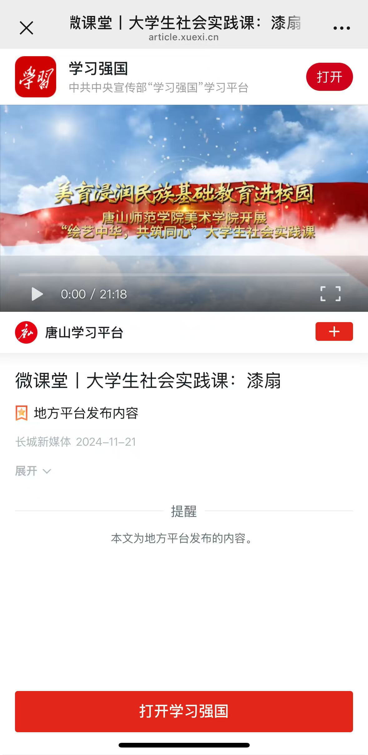 学习强国:https://article.xuexi.cn/articles/index.html?art_id=4623939431057018300&item_id=4623939431057018300&cdn=https%3A%2F%2Fregion-hebei-resource&study_style_id=video_default&pid=&ptype=-1&source=share&share_to=wx_single