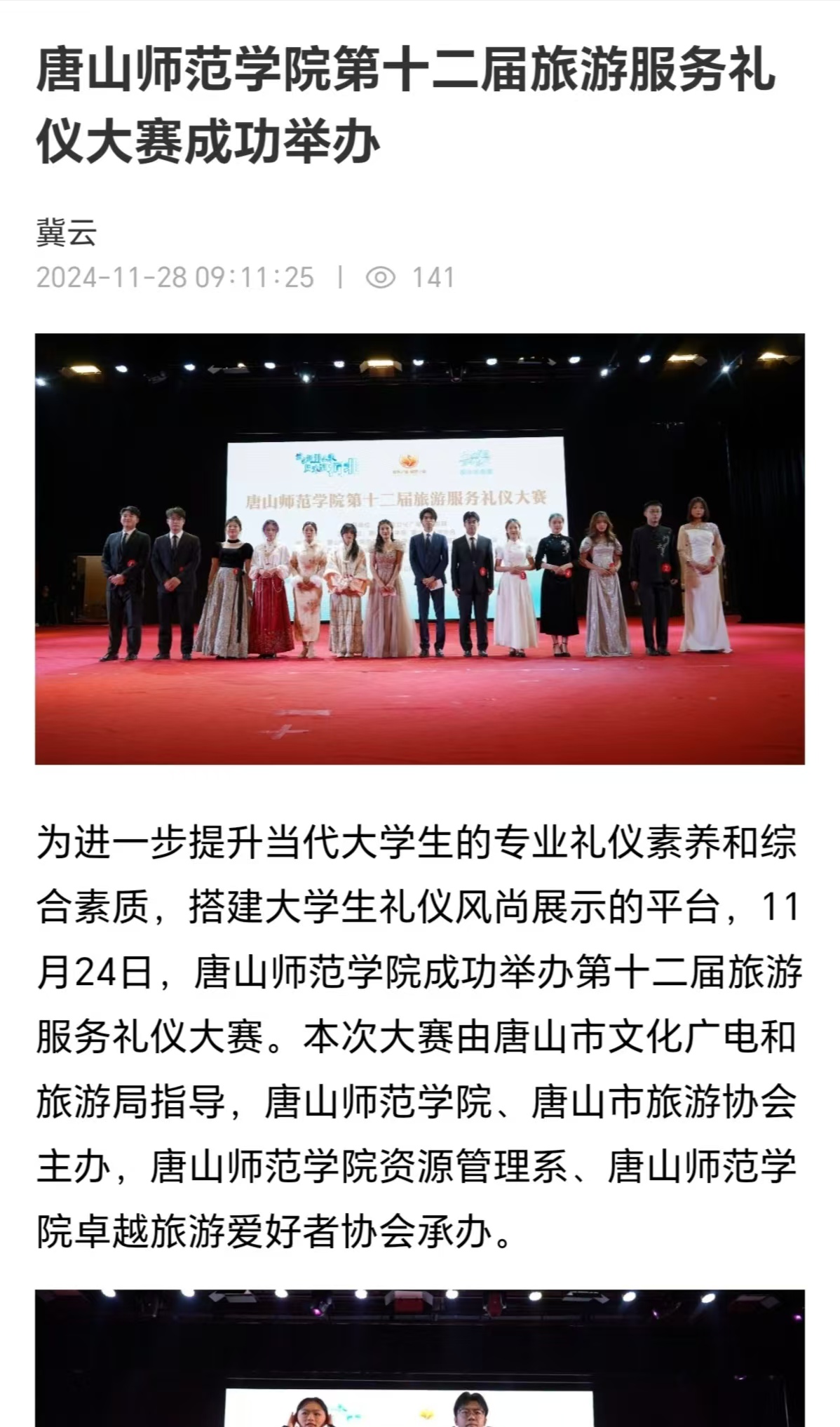为进一步提升当代大学生的专业礼仪素养和综合素质,搭建大学生礼仪风尚展示的平台,11月24日,万象城awcsport官网成功举办第十二届旅游服务礼仪大赛。本次大赛由唐山市文化广电和旅游局指导,万象城awcsport官网、唐山市旅游协会主办,万象城awcsport官网资源管理系、万象城awcsport官网卓越旅游爱好者协会承办。