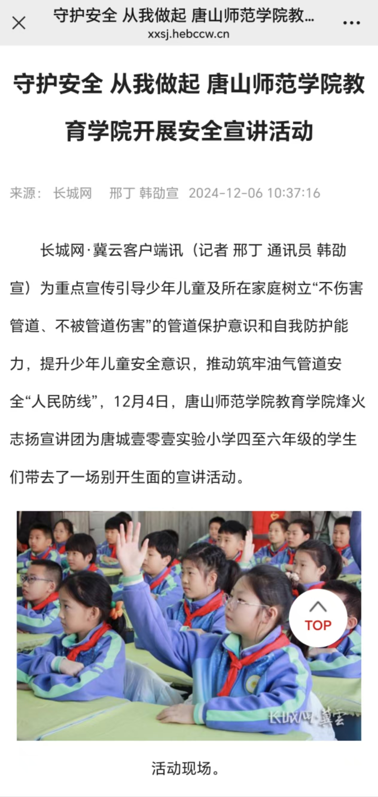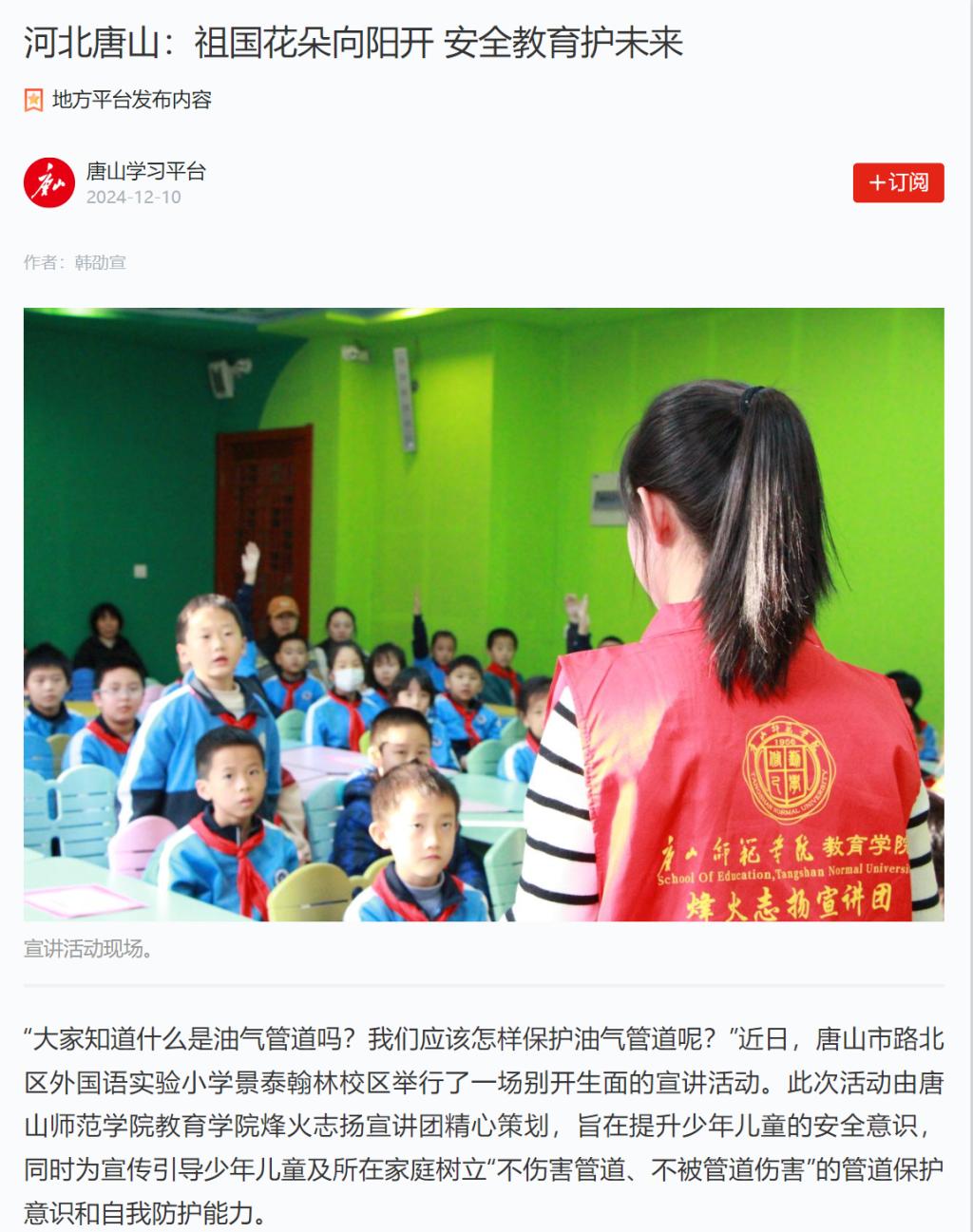 为重点宣传引导少年儿童及所在家庭树立“不伤害管道、不被管道伤害”的管道保护意识和自我防护能力,提升少年儿童安全意识,推动筑牢油气管道安全“人民防线”,12月4日,万象城awcsport官网教育学院烽火志扬宣讲团为唐城壹零壹实验小学四至六年级的学生们带去了一场别开生面的宣讲活动。