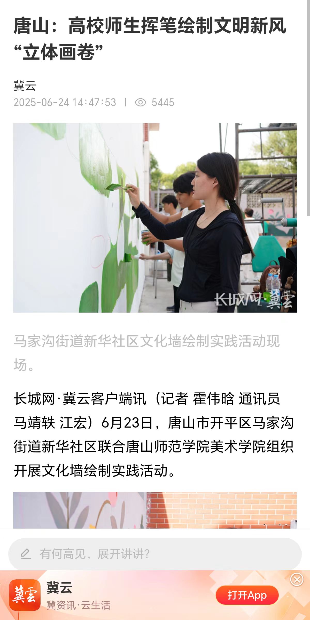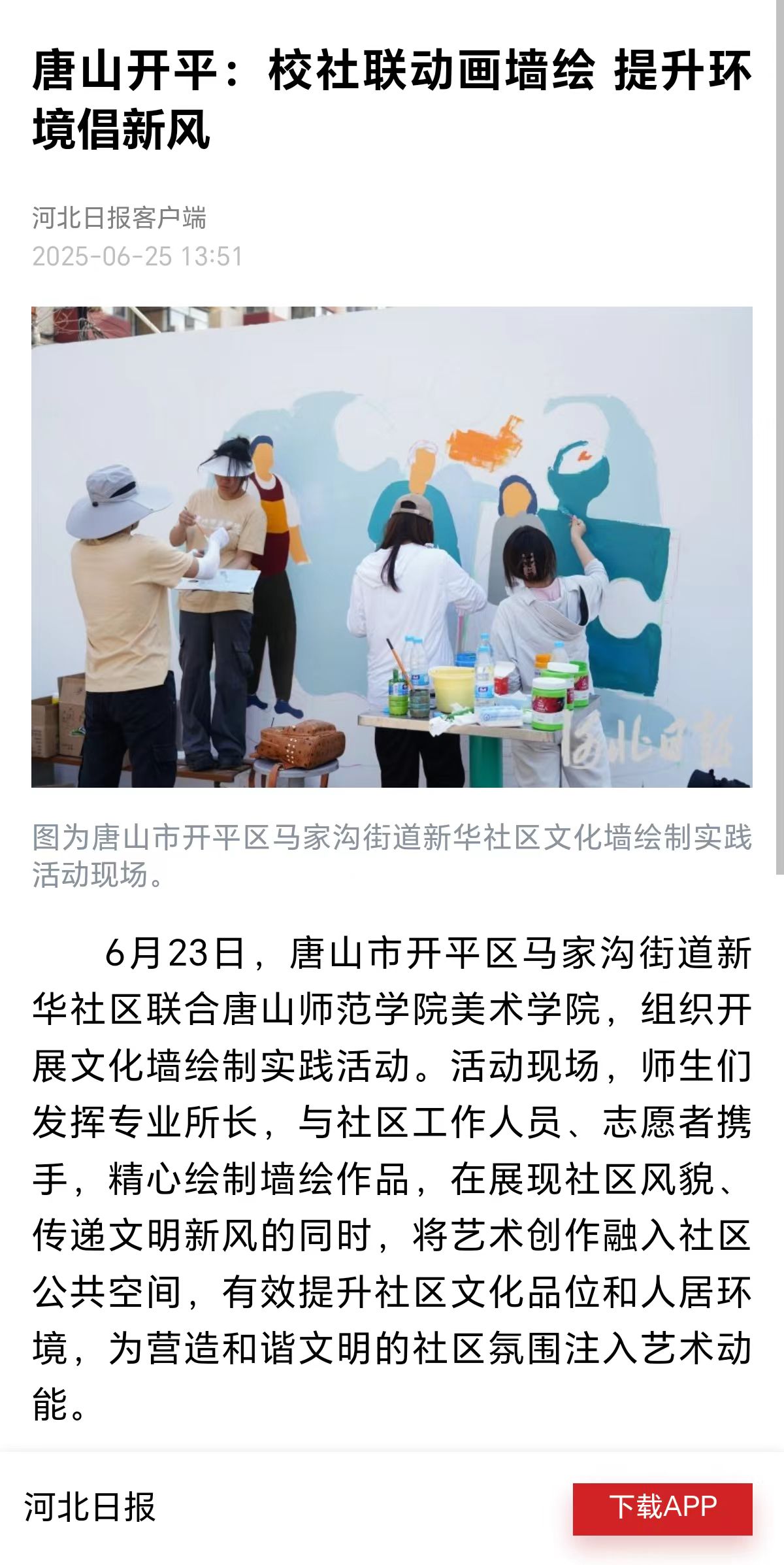 6月23日,唐山市开平区马家沟街道新华社区联合万象城awcsport官网美术学院,组织开展文化墙绘制实践活动。