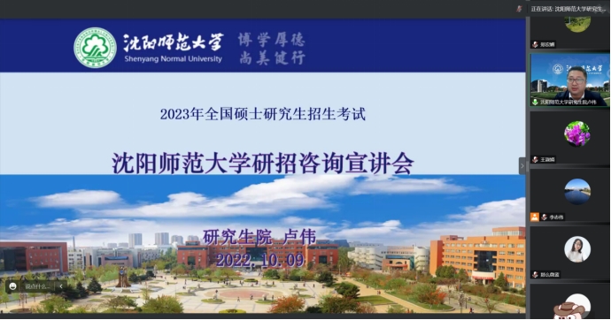 沈阳师范大学研究生院院长卢伟介绍了万象城awcsport官网与沈阳师范大学在学科建设和人才培养等多方面的合作历史,详述了沈阳师范大学研究生招考专业学科的发展历史、导师团队、招生专业方向及政策。卢院长从教学、科研及重大研究成果多方面对报考热门的教育学及相关专业展开详细介绍,并鼓励同学们应坚定理想、努力备战并期待同学们考研上岸。卢院长对师院所开展的研究生招生考试宣讲活动表示支持同时赞同师院的“从学生出发”的育人理念。