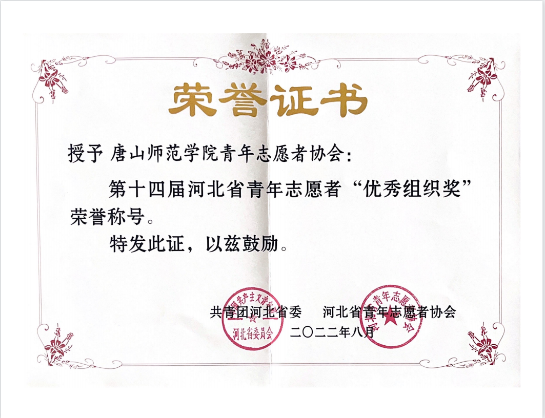 近期,由共青团河北省委、河北省青年志愿者协会开展的第十四届河北省青年志愿者行动的评选工作圆满结束。师院青年志愿者协会荣获第十四届“河北省青年志愿者优秀组织奖”,刘佳奇同学荣获河北省青年志愿者优秀奖。