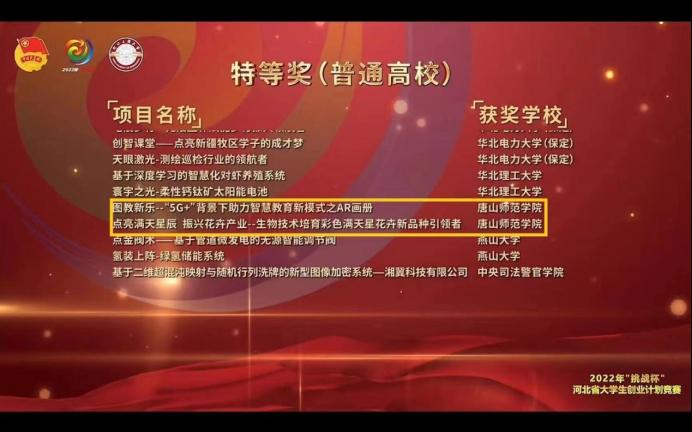 近日,由共青团河北省委、省教育厅、省人力资源和社会保障厅、省科协、省学联共同主办的2022年“挑战杯”河北省大学生创业计划竞赛终审落下帷幕,师院再获佳绩,在河北省同类院校中排名第一。共荣获特等奖2项、一等奖6项、二等奖9项、三等奖7项,同时获得河北省“挑战杯”创业计划竞赛优秀组织奖,马宁、包颖两位教师获得省“挑战杯”优秀指导教师奖。其中,计算机科学系马宁等老师指导的项目《图教新乐——“5G+”背景下助力智慧教育新模式之AR画册》以及生命科学系包颖等老师指导的项目《点亮满天星辰——基于生物技术彩色满天星花卉新品种培育》荣获特等奖并晋级国赛,物理科学与技术学院张蕾等老师指导的项目《闪闪小红星——打造红色乡村育人新路径》通过“国赛直通车”晋级国赛。