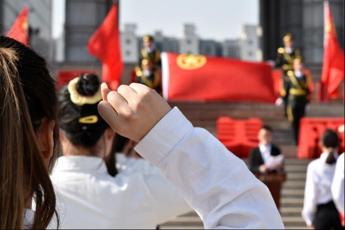 早8时,大学道校区南院举行升国旗仪式,迎接第103个五四青年节。来自师院各院(系)的本年度新入团团员代表、师院团学骨干代表齐聚主楼前广场,共同见证五星红旗冉冉升起的庄严时刻。仪式后,2022年度新团员入团仪式接续举行,团员青年一致表示“爱国是青春最亮丽的底色”“奋斗的青春最美丽”,并决心通过努力学习、努力实践,铭记历史,传承红色基因,永远跟党走,用实际行动兑现庄严誓言,用心用情融入师院内涵式高质量发展,无愧于“共青团员”这一光荣称号,无愧于“师院新青年”这一身份标签。