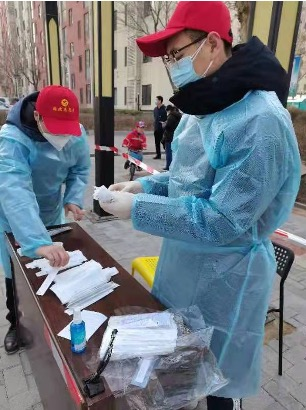 疫情来袭,危难当前,体育系教师党支部书记石永秀挺身而出,第一时间到社区报备,参加社区疫情防控服务。石永秀老师每天早晨七点半准时报到,领取防护物品并穿戴整齐,八点进行入户核酸检测,社区内的核酸检测工作结束后,他马上转到社区外围光明路至友谊路之间新华道南侧的宝岛妇产医院、兴业银行、张家口银行、中国联通、七天酒店、牙博士、恒辉公司、唐人街等企业,对所有商户进行核酸检测,直到下午五点左右才能完成,一天连续工作六至八小时,忙起来中午饭经常顾不上吃。