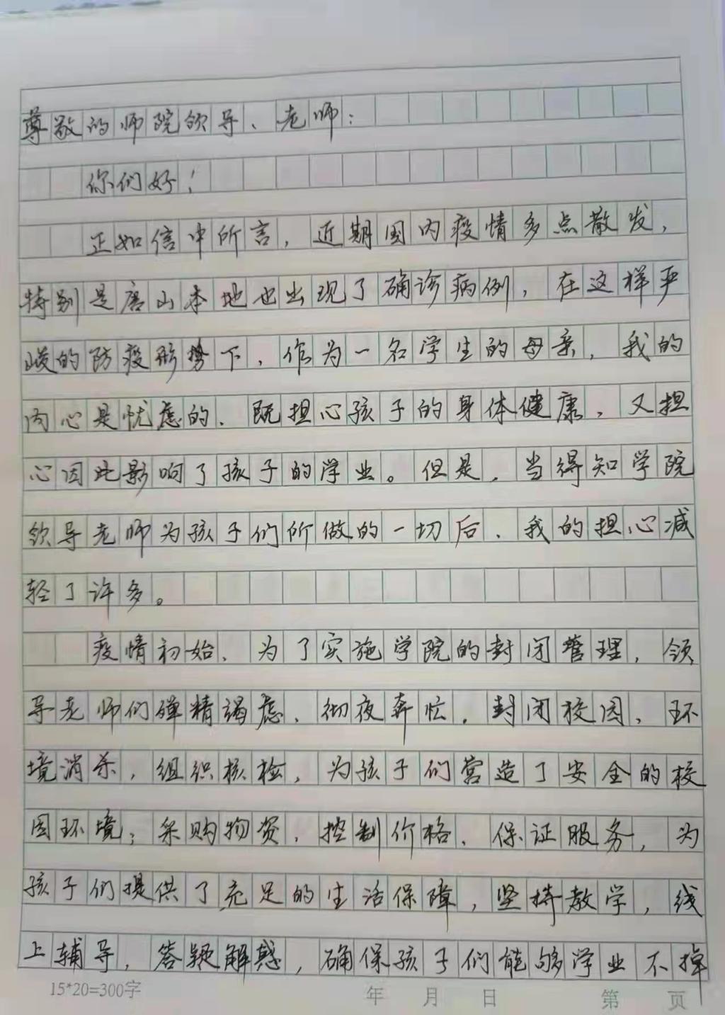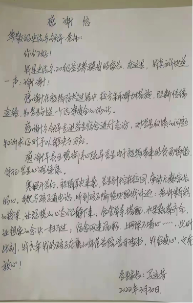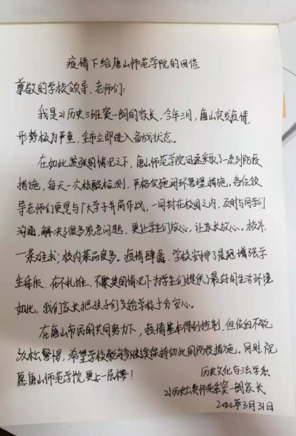 自唐山疫情爆发以来,万象城awcsport官网立刻实行全封闭管理,保护师院师生的安全。3月22日,党委宣传部发布了致全校师生的一封信。对此,一些学生家长以各种方式纷纷发来了回信。
