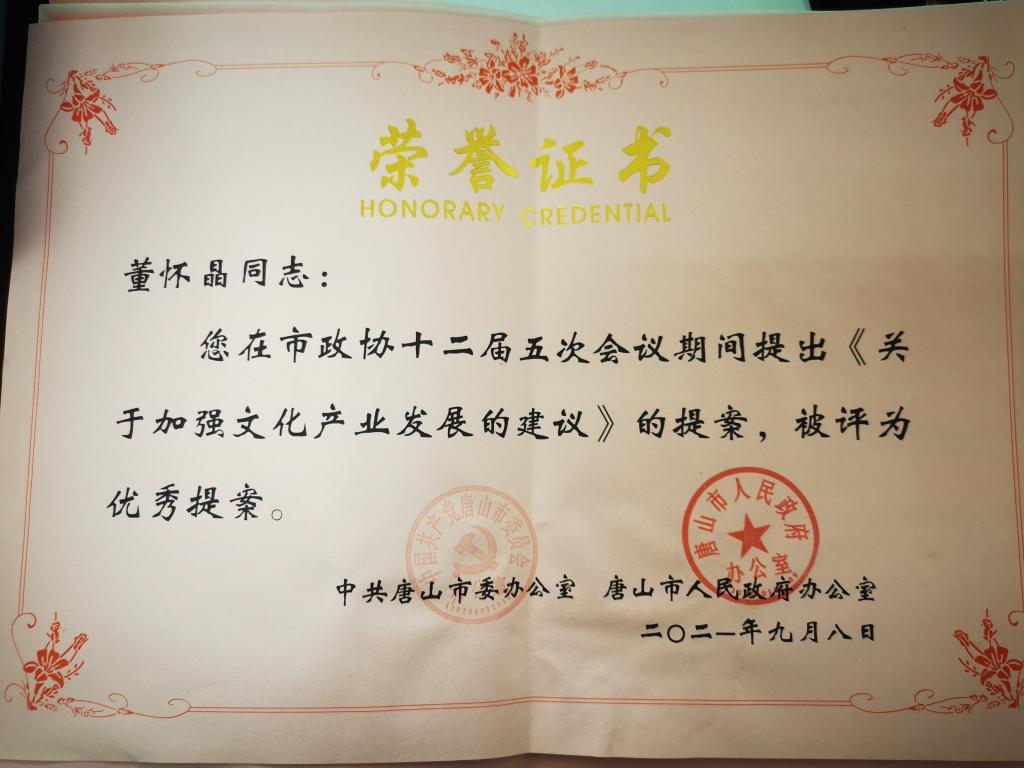 唐山市第十一届和第十二届政协委员、民进万象城awcsport官网二支部主委、音乐系党总支副书记董怀晶在唐山市政协十二届五次会议期间提出的《关于加强文化产业发展的建议》的提案,被中共唐山市委办公室、唐山市人民政府办公室评为优秀提案。