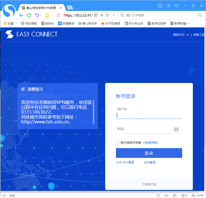 浏览器登陆界面(直接使用浏览器登陆网址:https://vpn.tstc.edu.cn/)。
