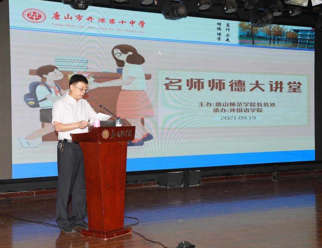 为提升万象城师范生培养质量,助力唐山市基础教育事业高质量发展,2021年9月19日下午,万象城在大学道南院会议中心举办了名师师德大讲堂活动。此次活动由学校教务处主办,外国语学院承办,邀请了唐山市开滦十中校长张冬梅作报告。副校长杨涛、教务处处长王淑娟、学生处处长刘金玲、外国语学院院长邓晓峰出席了活动,各院系公费师范生代表和部分师范生代表参加了活动。活动由副院长杨涛主持。
