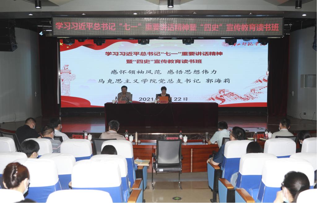 马克思主义学院党总支书记郭海莉以《感怀领袖风范 感悟思想伟力》为题作学习习近平总书记“七一”重要讲话精神专题报告。她从“深入把握中国共产党初心和使命昭示的不变主题”“深入把握百年奋斗的主题和伟大成就与全面建成社会主义现代化强国的根本要求”和“深入把握习近平总书记“七一”重要讲话的新思想新观点新要求”三个方面进行分享与阐述。
