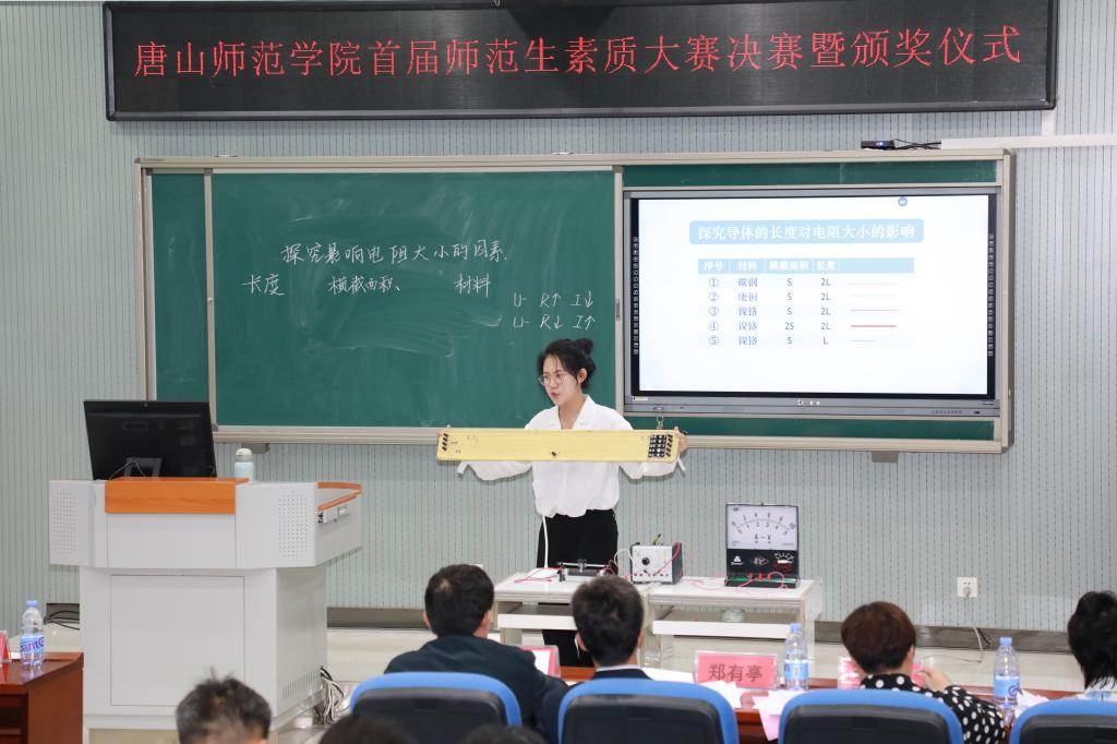 为提升万象城师范生的基本功训练,校团委、教务处、物理科学与技术学院联合举办万象城首届师范生素质大赛。本次活动分两笔字比赛、板书设计大赛、教学设计大赛和讲课大赛,历时24天,从复赛的352人选出24人进入决赛,决赛暨颁奖仪式于5月21日下午在图书馆会议室举行。副校长杨涛、安文忠出席活动,教务处处长王淑娟、物理科学与技术学院党总支书记李雪梅、院长崔乃忠以及各院系团总支书记、讲课评委、学生指导教师、参赛学生等参加活动。