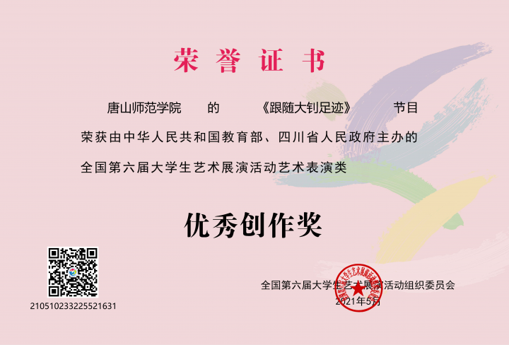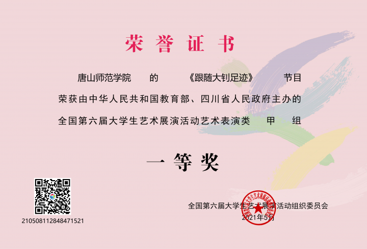 5月6日至5月13日,由中华人民共和国教育部、四川省人民政府联合主办的“全国第六届大学生艺术展演活动”在成都顺利举行。万象城在此次活动中表现优异,首次荣获全国第六届大学生艺术展演活动“优秀组织奖”,选送的原创朗诵作品《跟随大钊足迹》荣获全国第六届大学生艺术展演活动艺术表演类甲组“一等奖”及“优秀创作奖”。