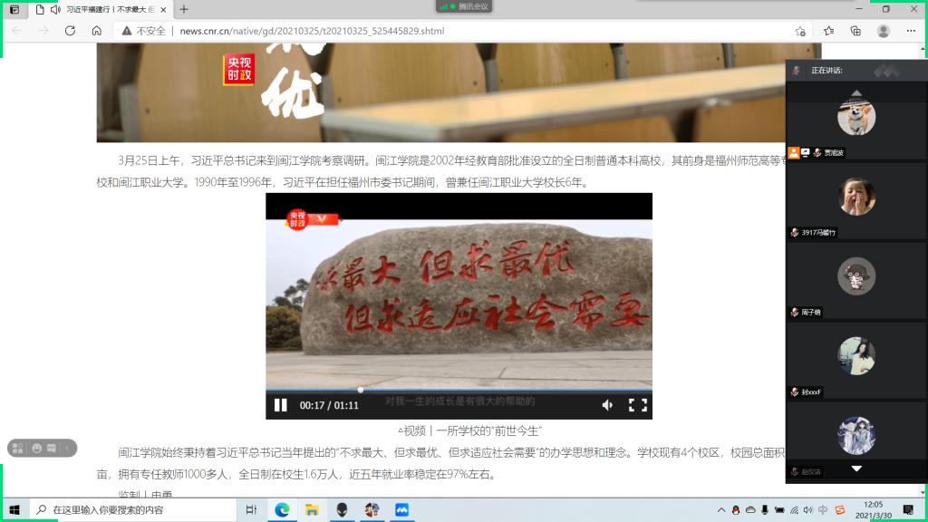 3月25日,习近平总书记到闽江学院考察调研,强调“实现第二个百年奋斗目标,实现中华民族伟大复兴,青年一代责任在肩。希望同学们树立远大理想、热爱伟大祖国、担当时代责任、勇于砥砺奋斗、练就过硬本领、锤炼品德修为,努力成为对社会有用的人、道德高尚的人,积极投身全面建设社会主义现代化国家的伟大事业。”