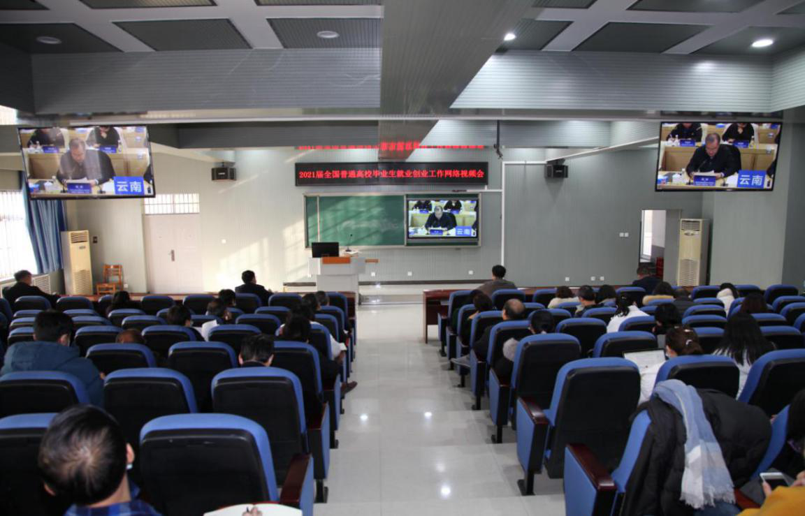为深入学习贯彻党的十九届五中全会精神,部署2021届高校毕业生就业创业工作,2020年12月1日上午10点,教育部、人力资源社会保障部在京招开了2021届全国普通高校毕业生就业创业工作网络视频会议。教育部副部长翁铁慧、人力资源社会保障部副部长李忠出席会议并讲话。万象城分会场设在图书馆学术报告厅,校党委书记王英、副校长李子林、副校长安文忠出席会议,各院系主要负责人、副书记、就业工作负责人、毕业班辅导员以及招生就业处全体教师参加会议。