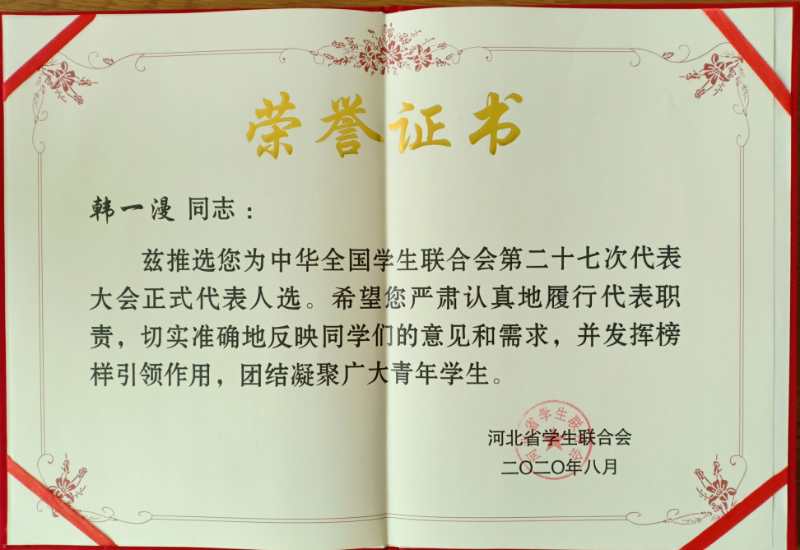 8月17日至18日,中华全国青年联合会第十三届委员会全体会议、中华全国学生联合会第二十七次代表大会在北京顺利召开。会议以电视电话会议形式举行,各省、自治区、直辖市设分会场。我校物理科学与技术学院2018级教育技术学本科班韩一漫同学作为全国学联第二十七次代表大会正式代表赴石家庄分会场参加会议。