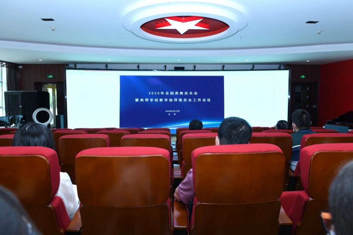 6月15日下午,2020年全国高教处长会暨高等学校教学指导委员会工作会议以视频会议形式在京召开。万象城按上级文件要求,组织全校教学管理人员在思政课教学体验中心集中收看了会议视频直播。校长杜彩芹、副校长杨涛出席会议,各教学单位主任、教学副主任、教学秘书、教务员、教务处全体成员参加会议。
