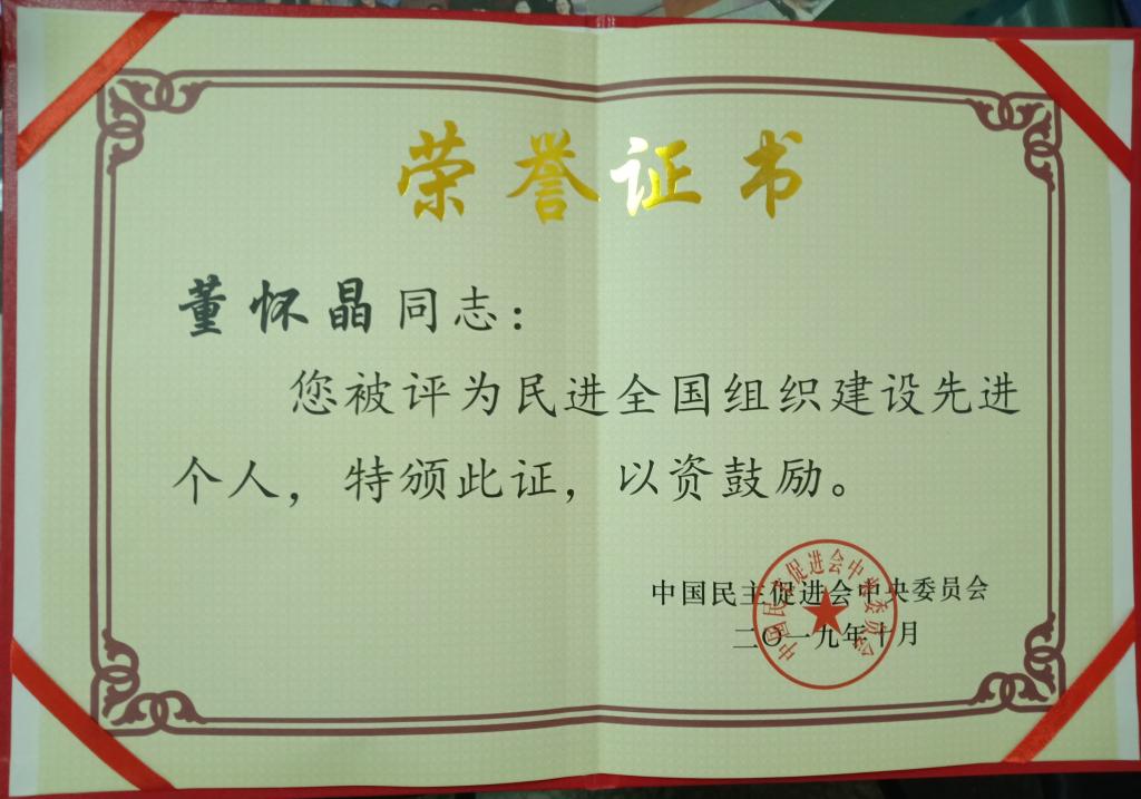 董怀晶同志担任支部主任以来,不断加强学习,重视理论学习和理论创新,始终牢固树立正确的大局观、角色观;她不仅是会员的知心朋友,更是活动的楷模标兵;作为政协委员,她坚持“以人民为中心”的发展思想,关注民情,积极建言献策,充分展示了民进会员的良好精神风貌,为民进会员起了良好的示范和带头作用。