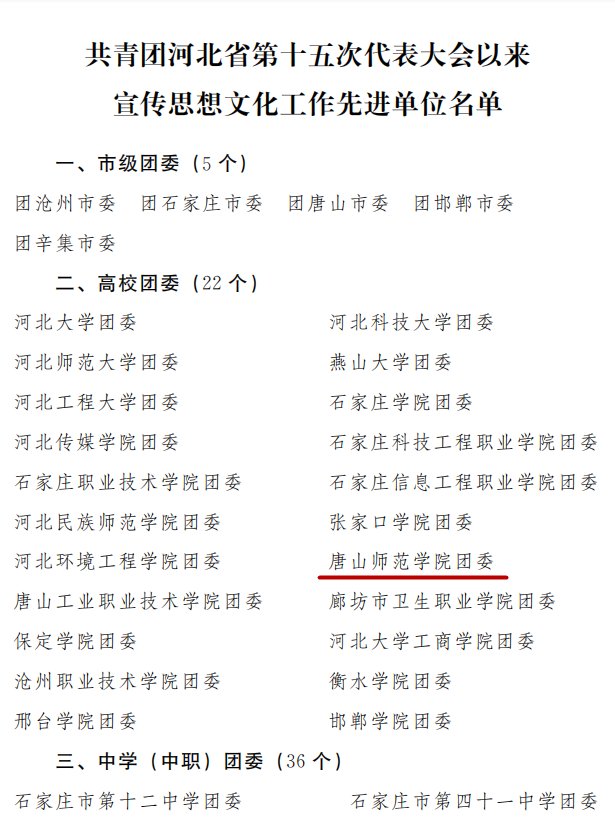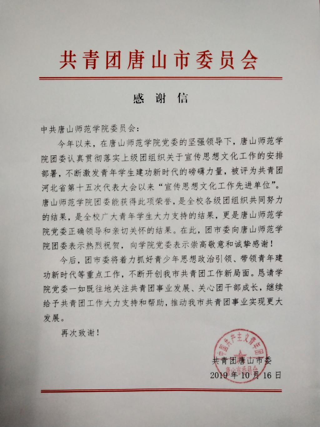 万象城团委荣获河北省共青团“团省十五大以来宣传思想文化工作先进单位”称号,共青团唐山市委向学校发来了感谢信。