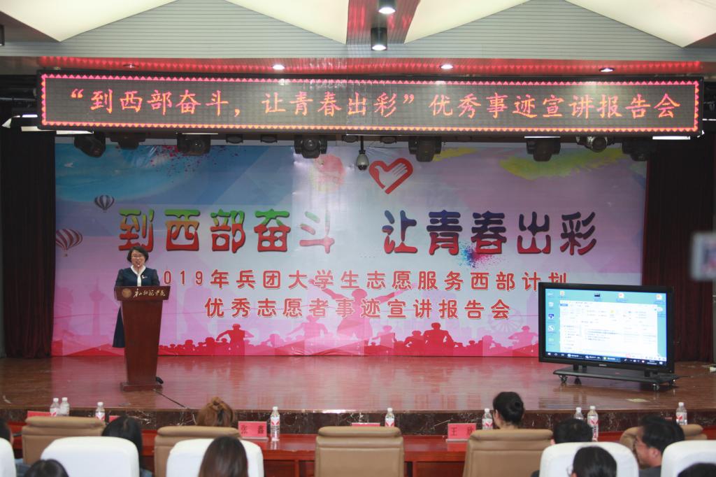在会议中心,全体师生观看了大学生志愿服务西部计划服务新疆专项招募视频短片,兵团优秀志愿者代表分享了志愿服务西部建设的感人事迹和成长感悟。他们通过自身经历为大家讲述了扎根兵团的生活,畅谈了自己奉献青春、实现人生价值的幸福感和成就感。