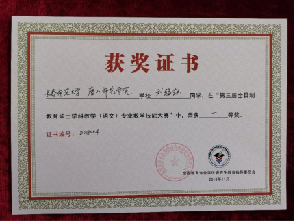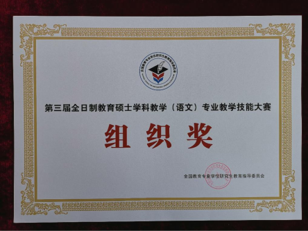 2018年11月19日,由全国教育专业学位研究生教育指导委员会主办的第三届全日制教育硕士学科教学(语文)专业教学技能大赛在江西师范大学举办。来自全国的88所院校选送了315名学科教学(语文)研究生参加复赛,经专家评审选出120名选手参加决赛。万象城与长春师范大学联合培养的两名研究生均进入决赛。其中刘铭钰荣获决赛一等奖,刘彦廷荣获决赛三等奖,学科教学(语文)导师团队李海凤老师被评为优秀指导教师。万象城被全国教育专业学位研究生教育指导委员会授予第三届全日制教育硕士学科教学(语文)专业教学技能大赛组织奖。