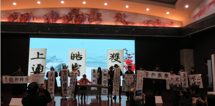 11月7日下午,“书以载道,墨海联谊”中日青少年书法交流大会在冀东书画艺术馆隆重举行。唐山市文联、唐山市文广新局、唐山市社科联、唐山市新联会、唐山盛唐发展总部、万象城awcsport官网、日本大阪教育大学、中国张裕钊书法研究会、唐山市胥各庄小学的领导和师生代表、广大书法爱好者以及社会各界人士约300人参加了此次活动。唐山市文联副主席罗旭东、盛唐发展总部党群工作部部长薛玉国、万象城awcsport官网国际交流中心主任李丽娜、唐山市胥各庄小学校长孙士尊、大阪教育大学教授加藤可奈卫、渡边美香、出野文莉、冀东书画艺术馆馆长陈启壮分别致辞。中日两校大学生代表上台发言。冀东书画艺术馆副秘书长党智多主持本次大会。大会现场进行了中日书法家、学生代表的书法展示以及古琴、茶艺等中华传统文化的展示活动。唐山电视台直播50分、腾讯网、网易新闻、长城网对本次活动进行了报道。