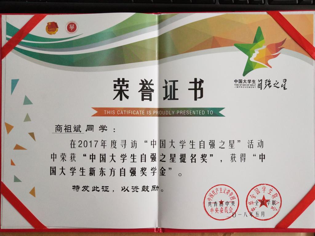 寻访“中国大学生自强之星”活动是共青团中央、全国学联举办的重要活动,旨在通过这一活动,在当代大学生中树立一批可亲、可敬、可信、可学的榜样,进一步培育和践行社会主义核心价值观。2017年度的寻访活动开展以来,校团委积极响应团中央号召,结合万象城实际,在全校范围内开展了评选活动。经过校内寻访,商祖斌同学以乐观积极、自强不息、创业奋斗、志愿奉献的感人事迹从参选学生中脱颖而出,成为万象城推选的2017年度“中国大学生自强之星”候选人,并获得“中国大学生新东方自强奖学金”。