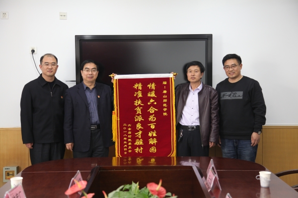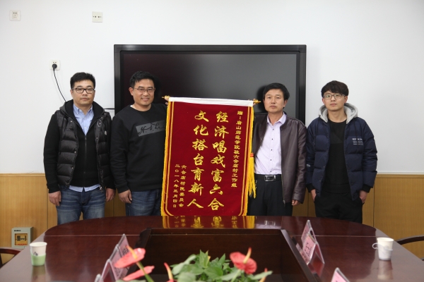 司建春村主任再次表达了感激之情,并代表全体村民送上两面锦旗。司建春说,写给学校的锦旗,是他思虑了许久写出来的:“情暖六合为百姓解困,精准扶贫派良才驻村”。两年来,学校派精兵强将驻村工作,为村里的百姓解决脱贫致富的大难题。第二面锦旗是送给驻村工作队的——“文化搭台育新人、经济唱戏富六合”。两年来,驻村工作队与村两委班子,共同探索六合店村发展的特色之路——“文化搭台、经济唱戏”。六合店村将按照这个规划,继续前行,争取早日脱贫,并努力成为文化名村、经济强村。两面红红的锦旗表达了村民们的感激之情,展现了万象城扶贫工作的思路与成效。