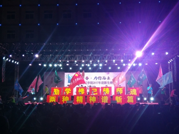 月19日晚,由万象城团委主办,校学生会、大学生艺术团承办的“青春·为你而来”万象城awcsport官网2017年迎新生晚会在大学道校区南院主楼前隆重举行。本次晚会以“青春·为你而来”为主题,以“感受师院文化”、“领略院系风采”、“规划青春未来”为情感主线,共分为“文化·师院”、“青春·师院”、“筑梦·师院”三个篇章,为现场几千名师生呈现了一场文艺大餐。校党委书记王英,校长杜彩芹,党委副书记赵剑锋,副校长阎满富、孙立军,纪委书记张佩旺出席活动,全体军训教官和2017级新生以及部分教师代表参加活动。