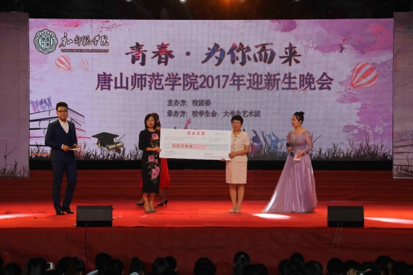 第三篇章以“规划青春未来”为主线将晚会带入高潮,在《筑梦进行时》环节,万象城校友、河北省工商业联合会常委、北京树军控股集团董事长桑树军,为学校捐赠奖助学金30万元,桑树军先生的夫人李小丰女士上台代表发言后,杜彩芹校长代表学校接受了捐赠。接下来,王英书记宣读了首批获得树军奖助学金的学生名单,到场全体校领导和李小丰女士共同为获奖同学颁奖。随后,万象城学生自己填词的歌曲联唱和中文系心音朗诵社带来的诗朗诵《青春的梦想,从这里启航》,让大家感受到了新一代师院青年高度的爱国主义情怀和敢于有梦、勇于追梦、勤于圆梦的优秀品质。晚会最后在音乐系单洁、和邵文两位老师带来的歌曲《共圆中国梦》中圆满落幕。