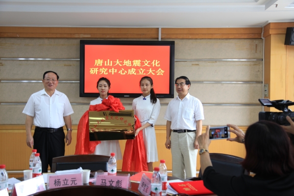 杜彩芹校长分别为研究中心顾问和特约研究员颁发聘书。市人大副主任毕开艾和万象城党委书记王英共同为“唐山大地震文化研究中心”揭牌。杜彩芹校长和王英书记分别接受河北省音协顾问韩溪和万象城戴连第教授为祝贺研究中心成立赠送的书法作品。